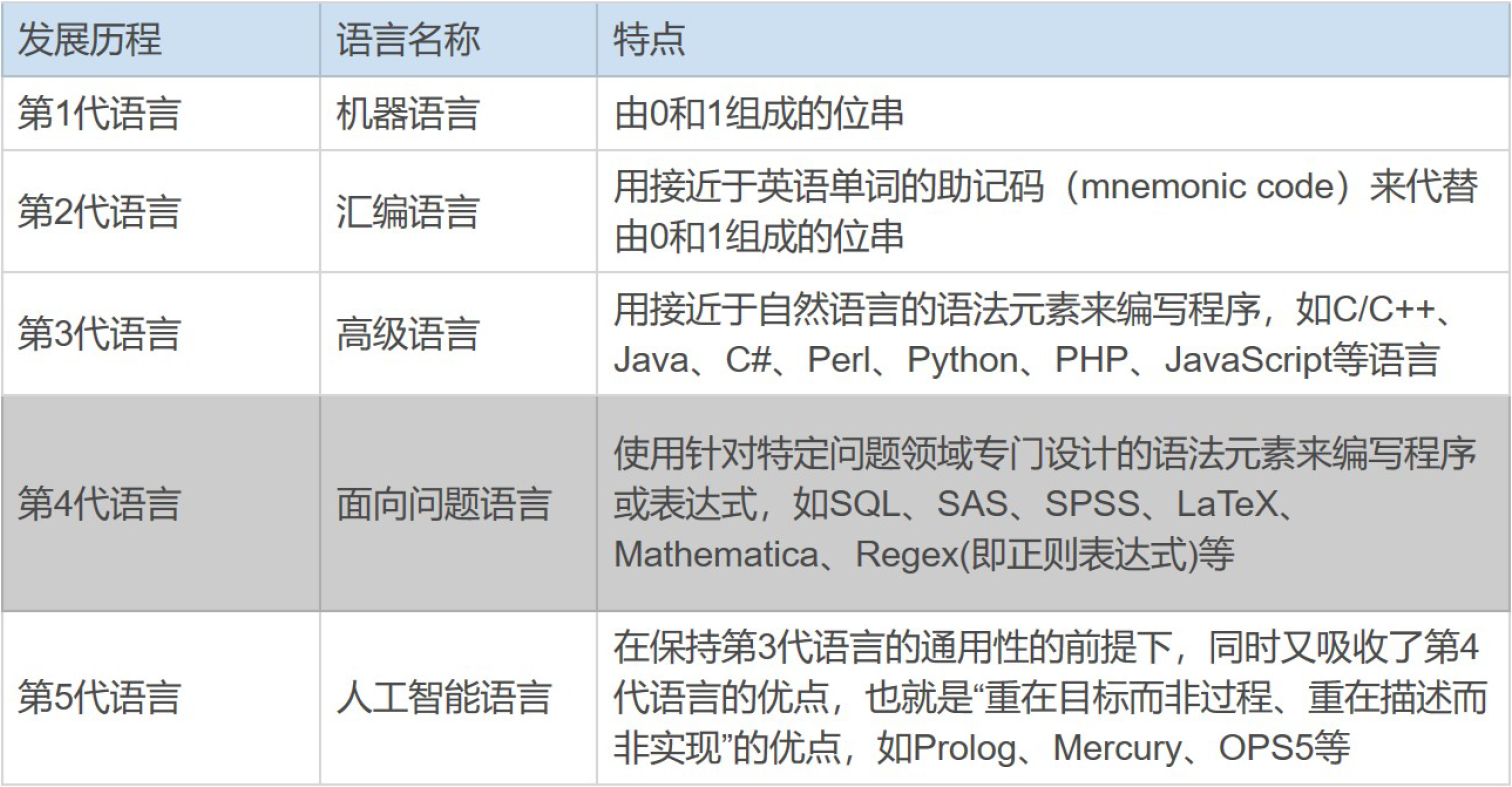 可以看到,第 4 代语言相对于第 3 代语言,更专注于某个特定、专门的业务逻辑和问题领域。程序员主要负责分析问题,以及使用第 4 代语言来描述问题,而无需花费大量时间,去考虑具体的处理逻辑和算法实现,处理逻辑和算法实现是由编译器(Compiler)或解释 器(Interpreter)这样的语言解析引擎来负责的。