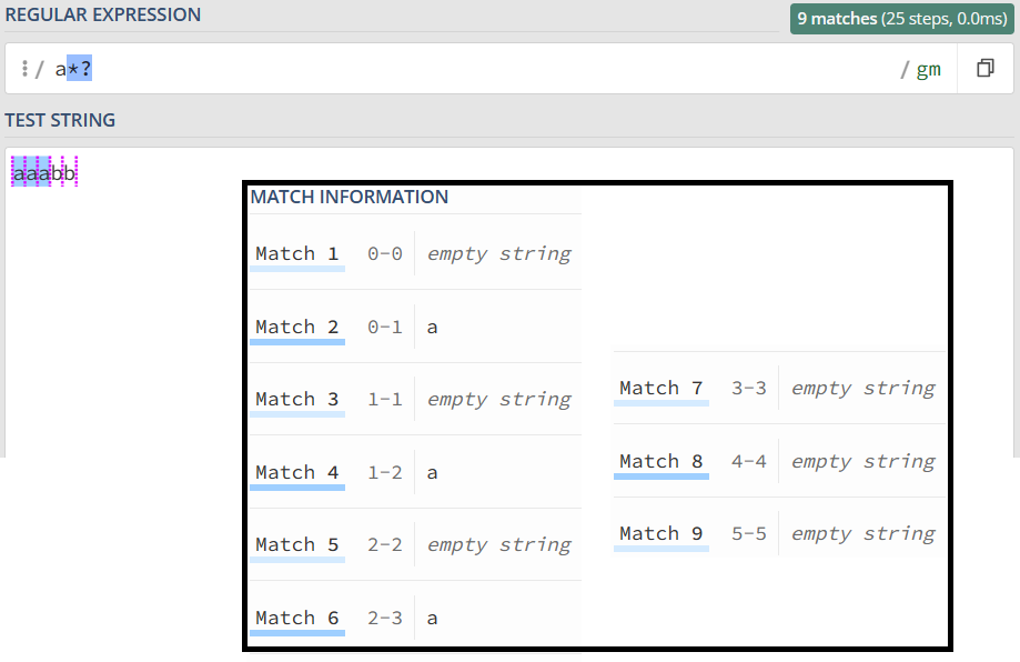 3)量词:如 *(零次或多次)、+(一次或多次)、?(零次或一次)、{n}(n次)、{n,}(至少n次)、{n,m}(至少 n 次,最多 m 次)等。