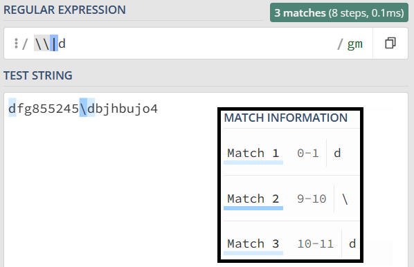 上面例子的反斜杠和 d 是连续出现的两个字符,如果你想表示成反斜杠或 d,可以用管道符号或中括号来实现,比如 \|d 或 [\d]。