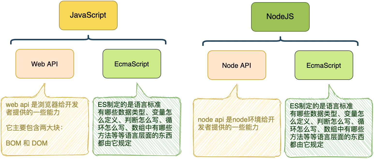 - 运行在 Node.js 上的 JavaScript 不能使用 DOM、BOM,但可以使用 Node.js 提供的各种 API(文件系统读写、网络 IO、加密、压缩解压文件等操作)。