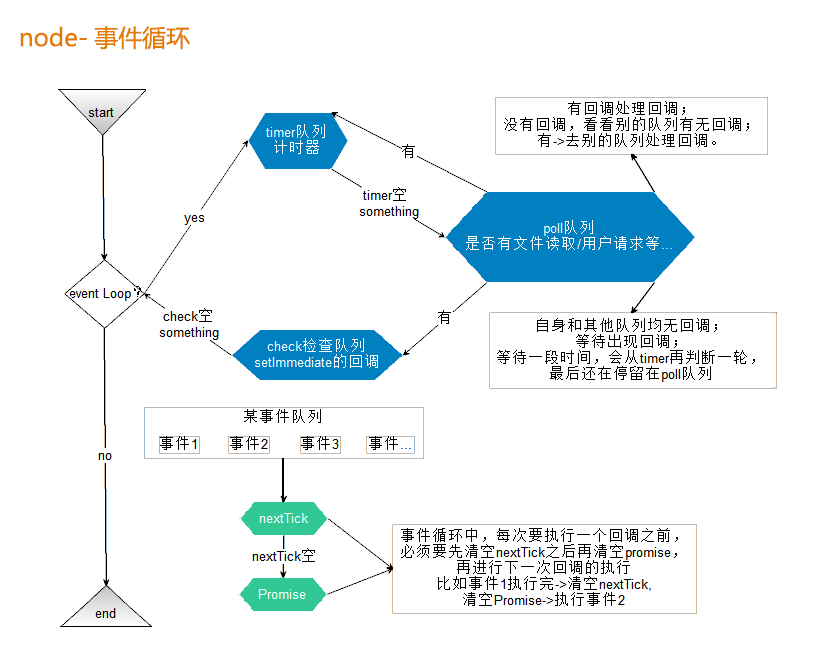 轮询阶段 (poll):检索新的 I/O 事件;执行与 I/O 相关的回调(几乎所有情况下,除了关闭的回调函数,那些由计时器和 setImmediate() 调度的之外),其余情况 node 将在适当的时候在此阻塞。