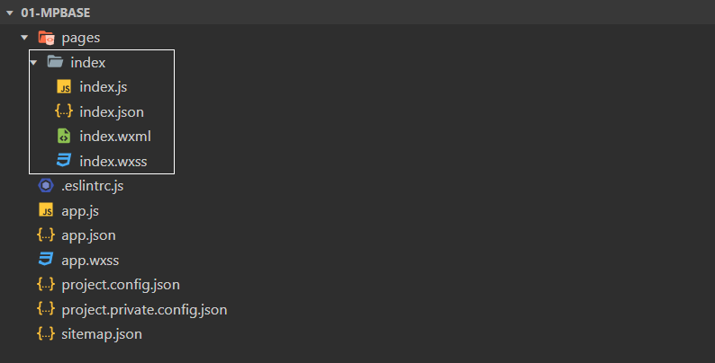 页面文件是每个页面所需的文件,小程序页面文件都存放在 pages 目录下,一个页面一个文件夹,每个页面通常由四个文件组成,每个文件只对当前页面有效: