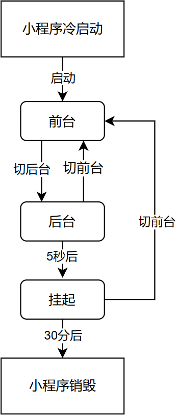 小程序启动后,后台会首先完成小程序的初始化,该过程只会触发一次;之后会完成显示的工作,用户可以操作小程序从前台进入后台以及从后台回复到前台显示;小程序在后台运行一段时间,当系统资源不足时会被注销。