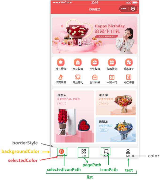 tabBar 字段:定义小程序顶部或底部 tab 栏,如果小程序是一个多 tab 应用,例如:可以在客户端窗口的底部或顶部通过 tab 栏可以切换页面,可以通过 tabBar 配置项指定 tab 栏的表现,以及 tab 切换时显示的对应页面。