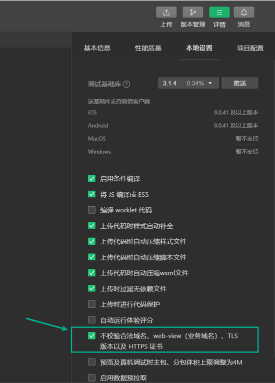 将不校验合法域名、web-view (业务域名)、TLS 版本以及 HTTPS 证书勾选上: