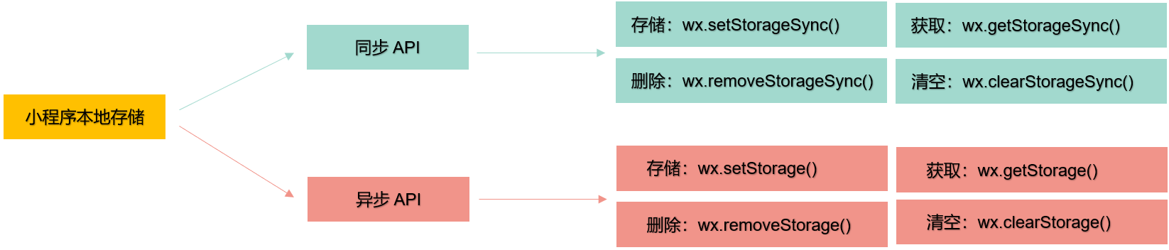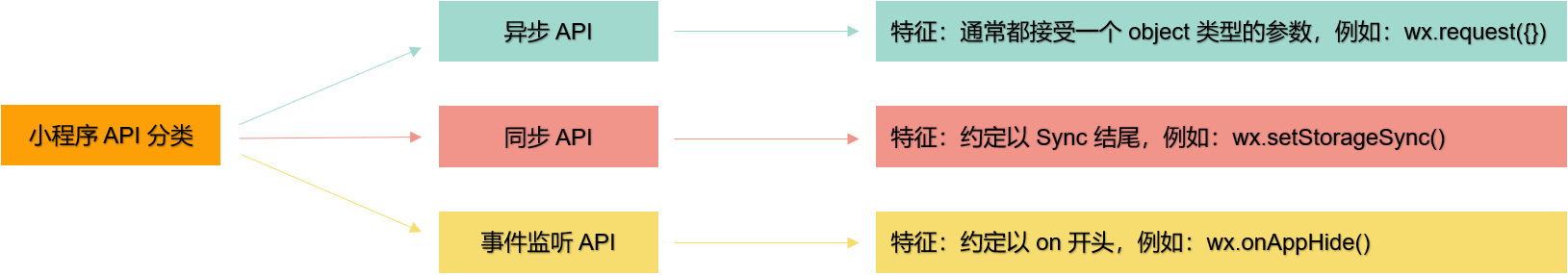 ③ 异步 API:大多数 API 都是异步 API,例如:wx.setStorage()。
