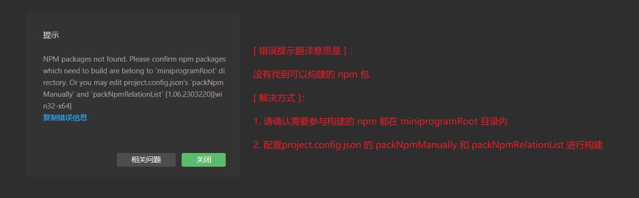 但是在调整目录以后,我们按照上一小节 Vant Weapp 的构建流程进行构建,发现没有构建成功,并且弹出构建失败的弹框。