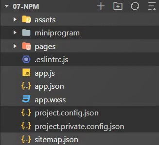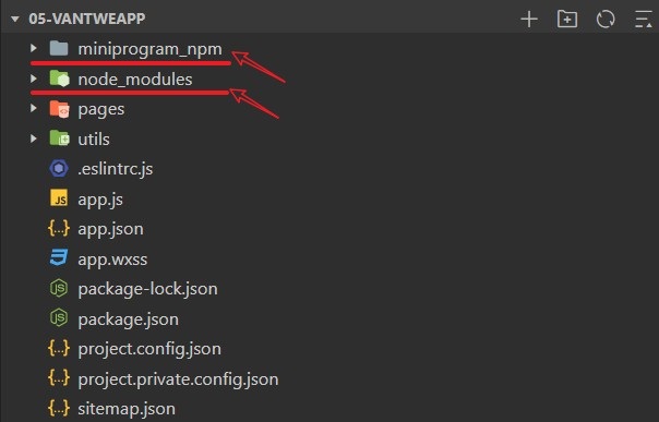 在构建成功以后,默认会在小程序项目根目录,也就是 node_modules 同级目录下生成 miniprogram_npm 目录,里面存放这构建打包后的 npm 包,也就是小程序运行过程中真正使用的包。