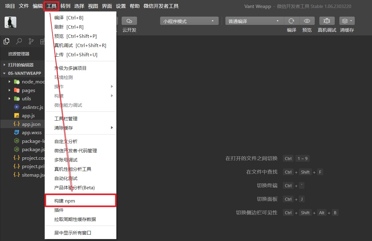 我们以使用 Vant Weapp 小程序 UI 组件库为例,来说明小程序如何安装和构建 npm,构建 npm 的步骤如下: