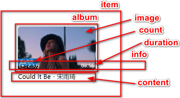 properties 接收视频信息,然后使用 Mustache 语法展示。使用 CSS 布局。
