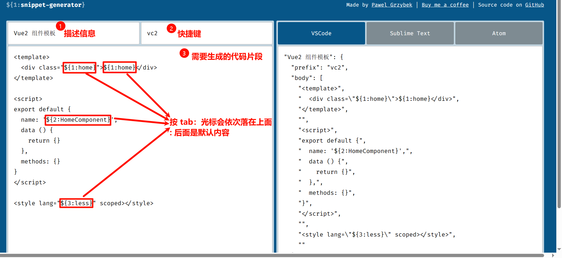 需要在 VSCode 编辑器中配置代码片段:设置 ==> user snippets ==> vue.json。