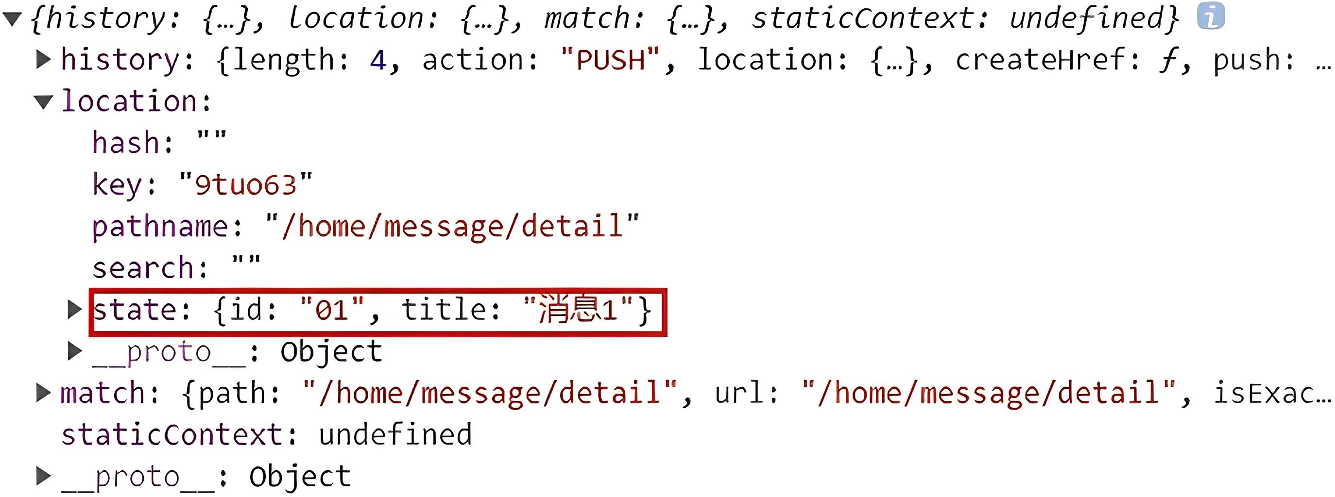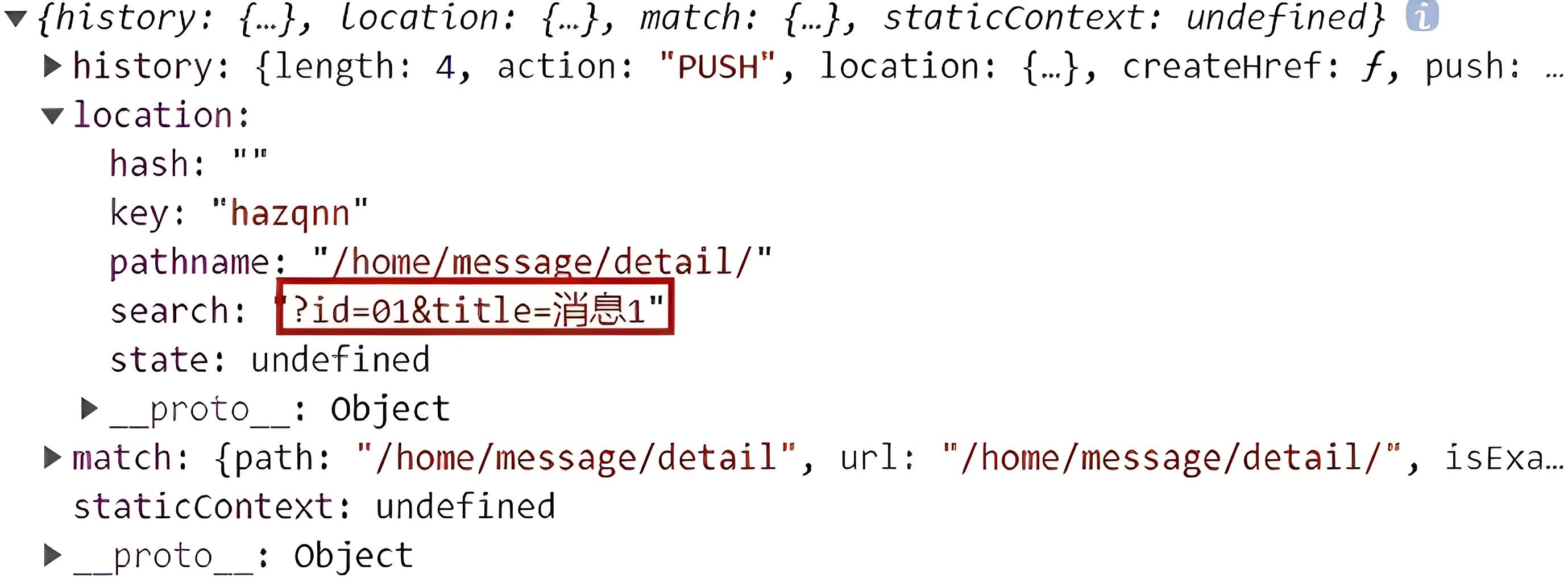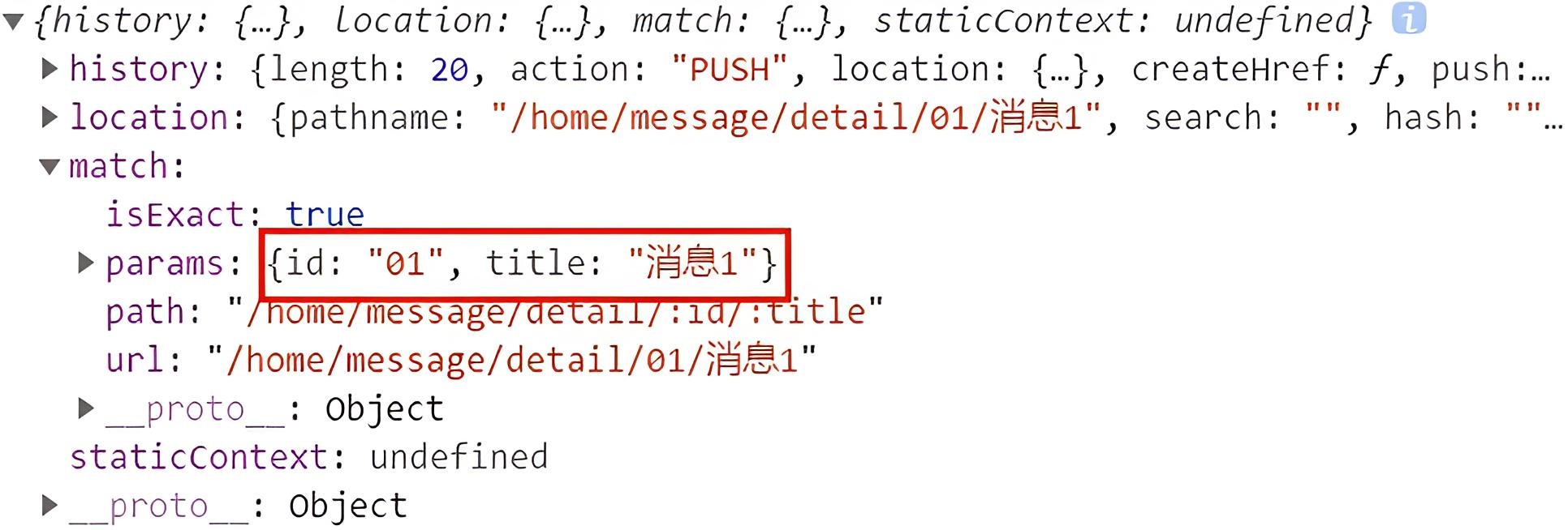 <Route path="/home/message/detail/:id/:title" component={Detail} />那之后怎么在 detail 组件中拿到传递过来的数据呢?还记得前面说过 路由组件:接收到三个固定的属性【history, location, match】,这些属性是以 props 传递的,也就是说,在 props 属性中有这三个属性。打印 this.props 来查看当前接收的数据情况。