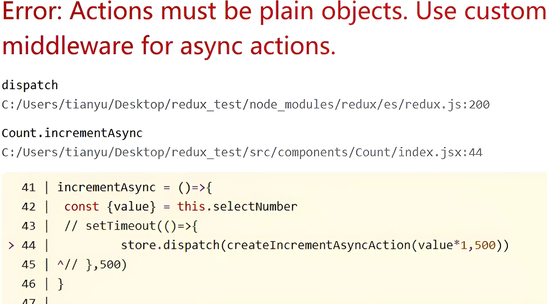 }当我们点击异步加操作时,我们会调用这个函数,在这个函数里接收一个延迟多长时间,还有 action 所需的数据,和原先的区别只在于返回的是一个定时器函数。