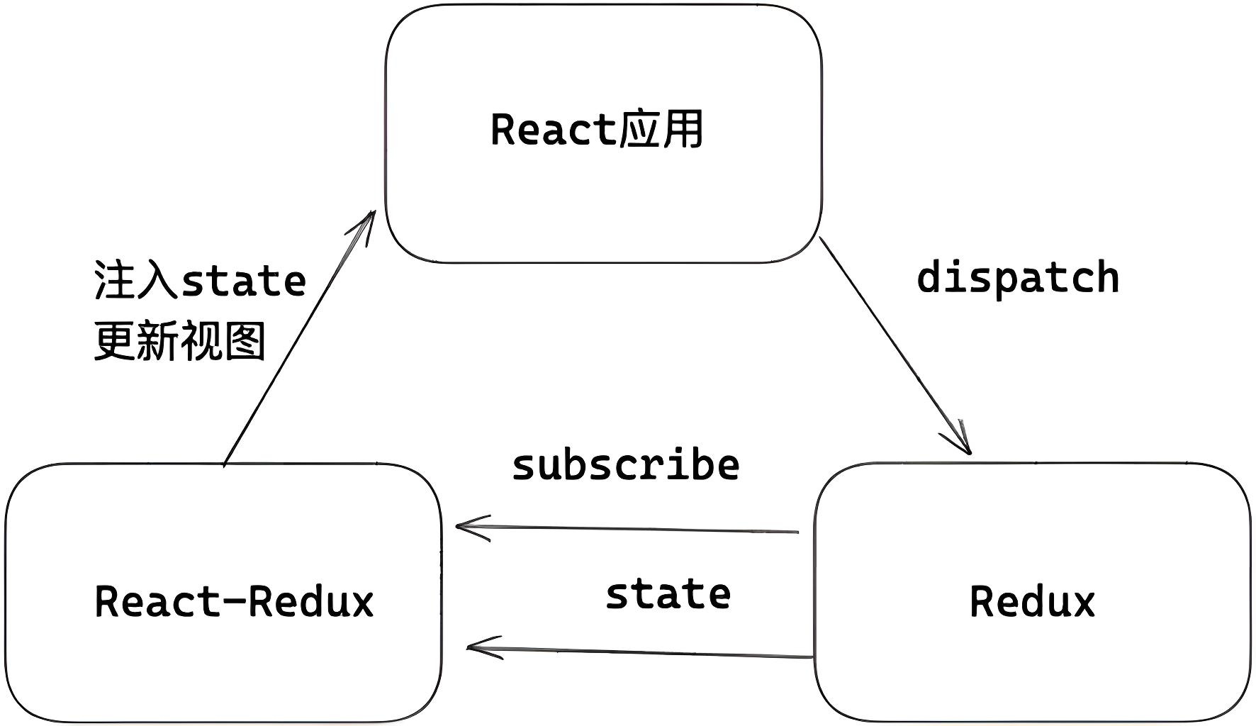 React-Redux:连接 React 应用和 Redux 状态管理的桥梁。主要专注两件事,一是如何向 React 应用中注入 redux 中的 Store;二是如何根据 Store 的改变,把消息派发给应用中需要状态的每一个组件。