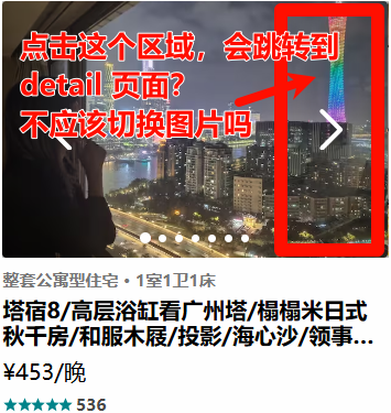 查看 @\components\room-item\index.jsx 代码,发现执行 controlClickHandle 事件时,会冒泡到 itemClickHandle 上,所以 itemClickHandle 事件执行,就来到详情页了。