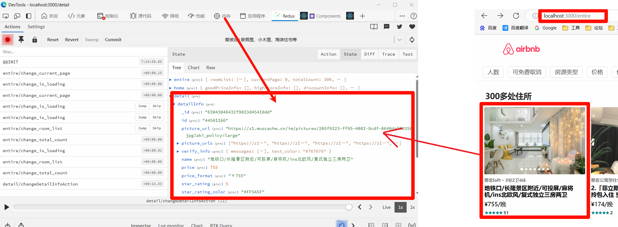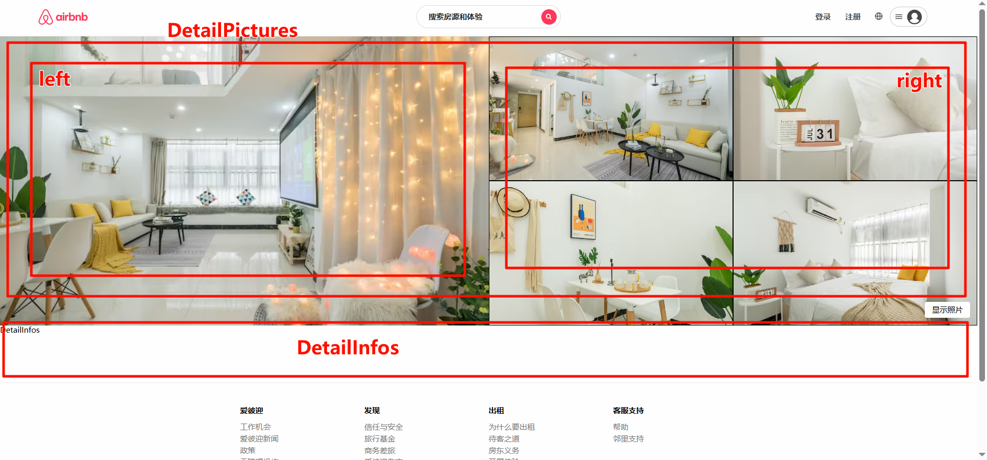 考虑到 RoomItem 组件首页与 entire 页都要用,且只有点击 entire 页的房屋 item 才跳转到 Detail。所以 RoomItem 的单击事件不在 RoomItem 组件中实现,谁用谁通过 props 传过来单击事件的实现。