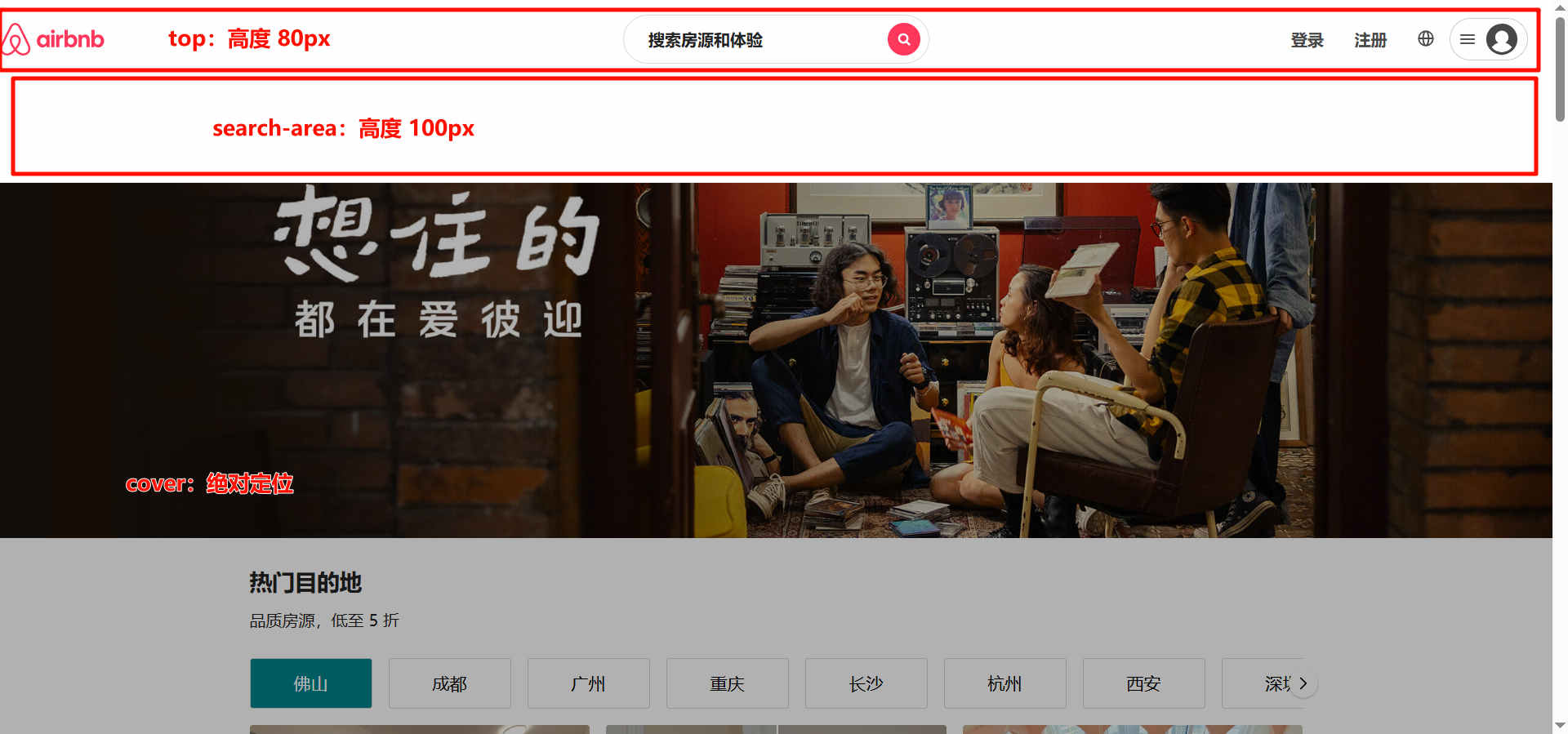 SearchArea 区域要隐藏或展示,当单击【搜索房源和体验】的搜索框时。还要动画。所以封装为组件。