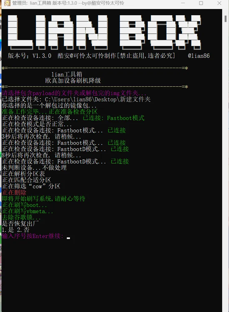 修复完成后,进入正常刷机流程,与【第一章:如意 ==> 二、降级 ==> 方法一:Lian_Payload_Flash_Tool】步骤一致: