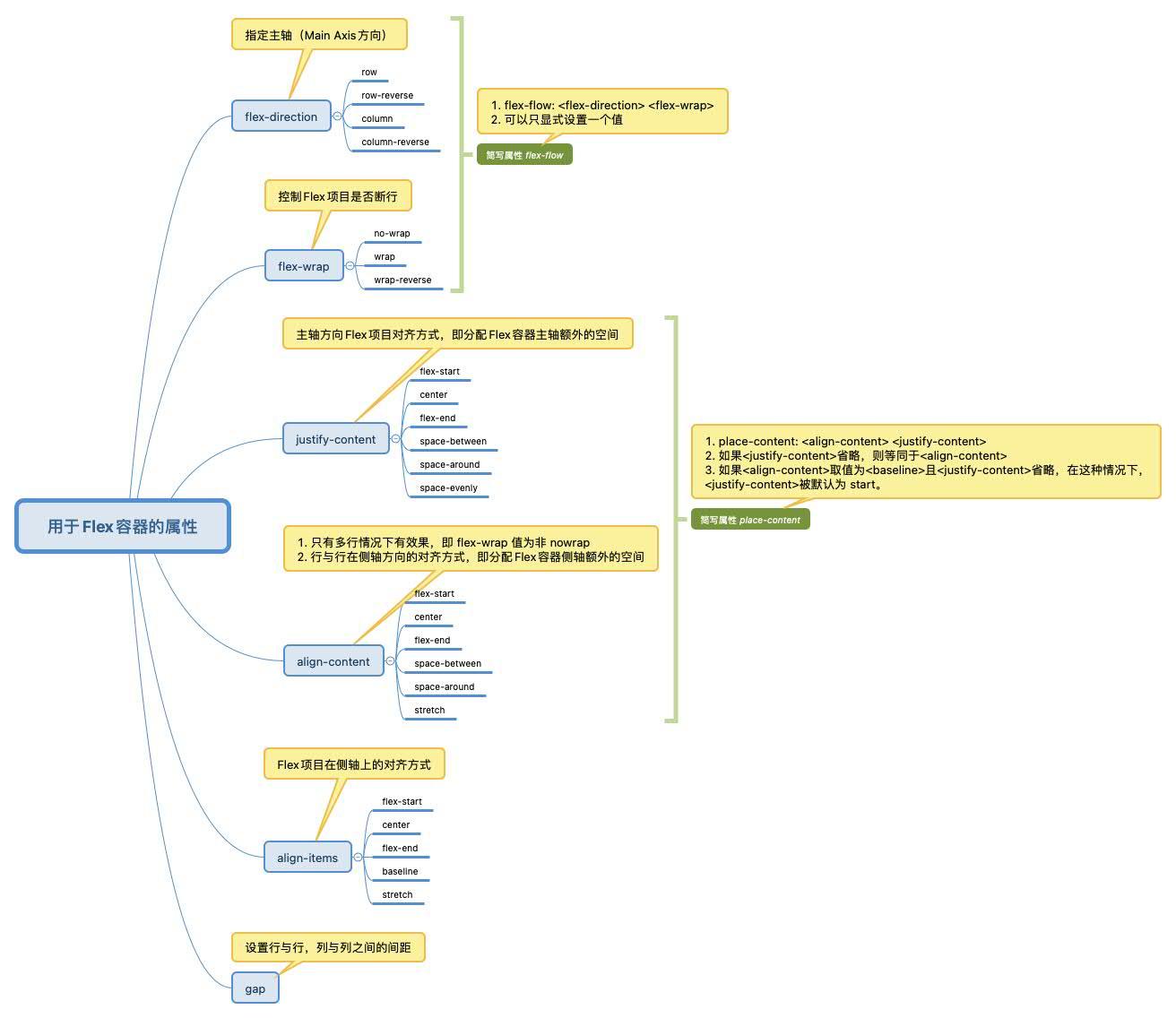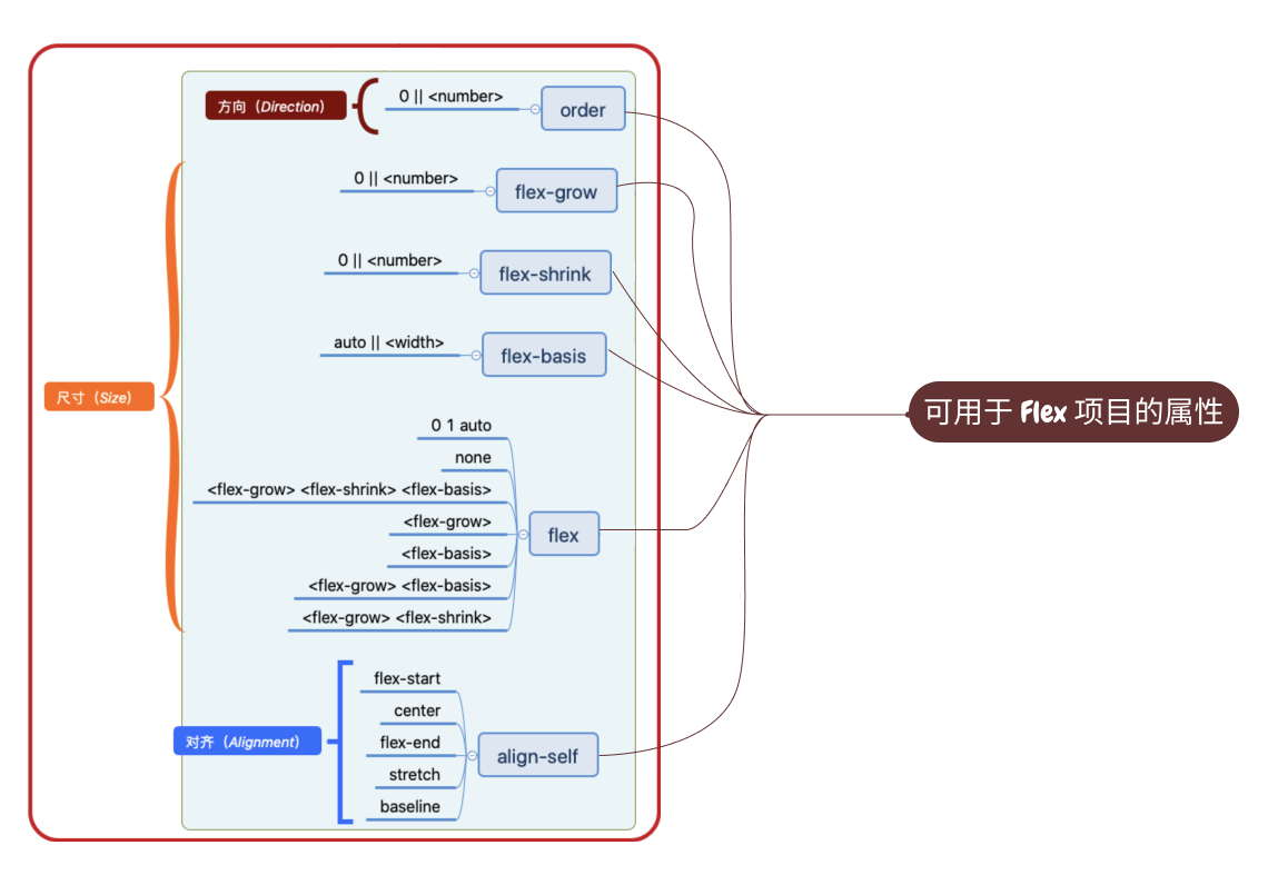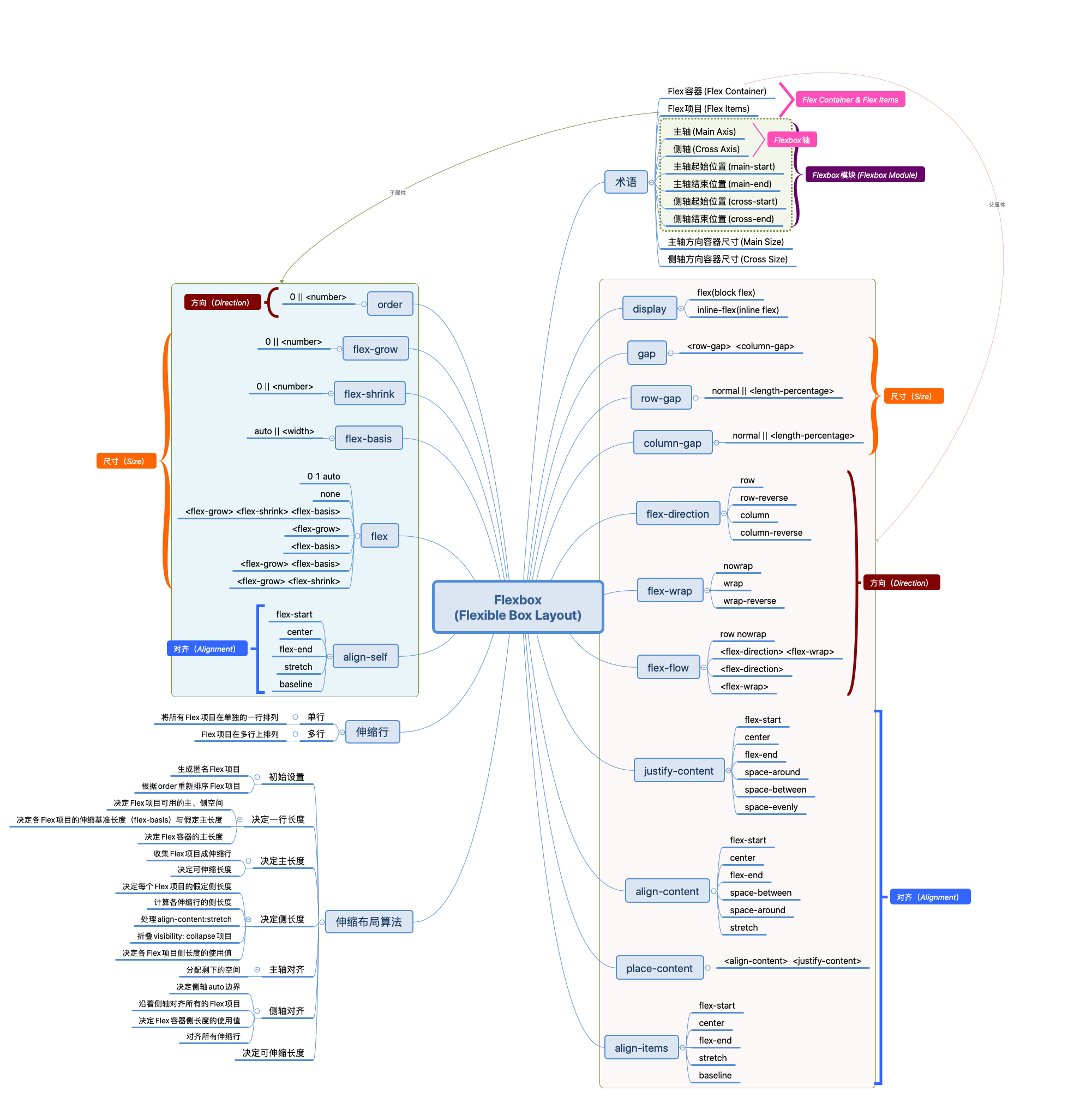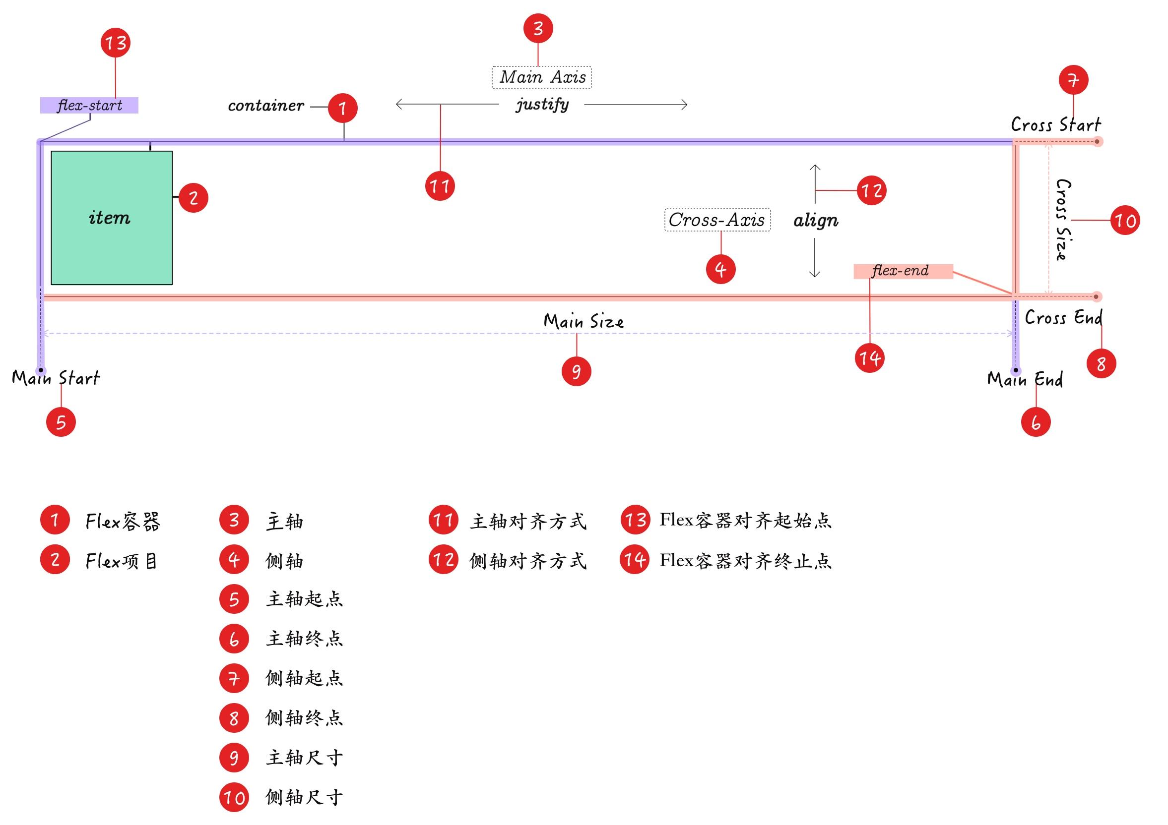 和以往的 Web 布局技术相比,Flexbox 布局所涉及的概念更多、更复杂,如下图所示: