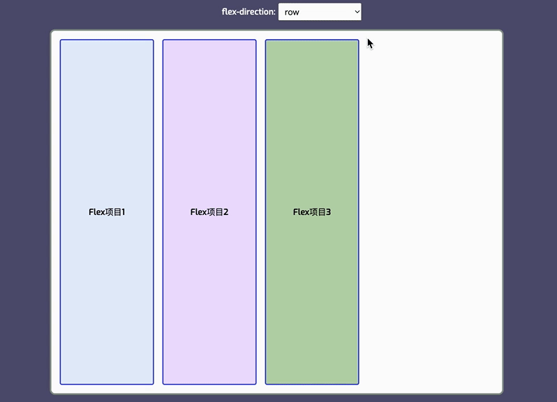 }尝试改变 Demo 中 flex-direction 属性的值,你将看到的效果如下: