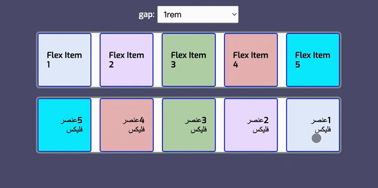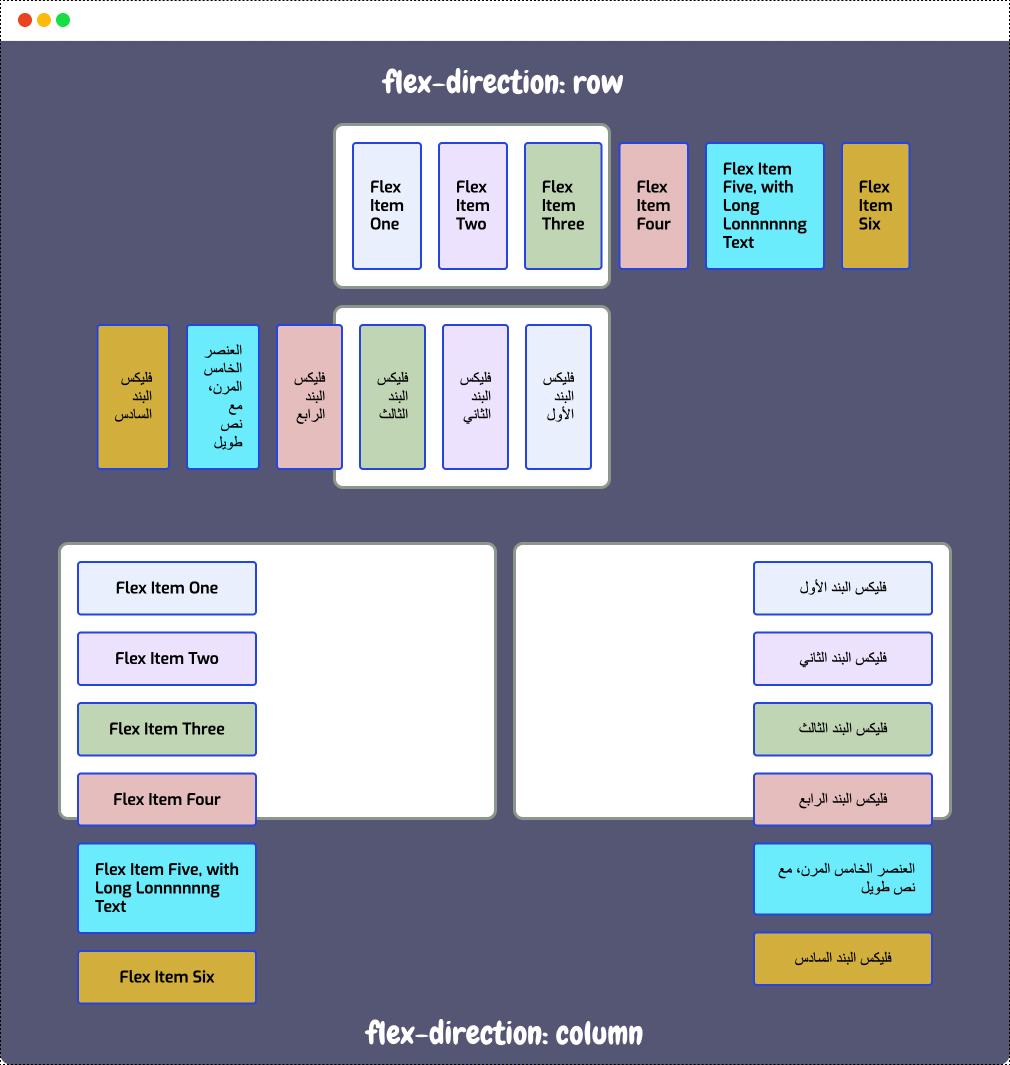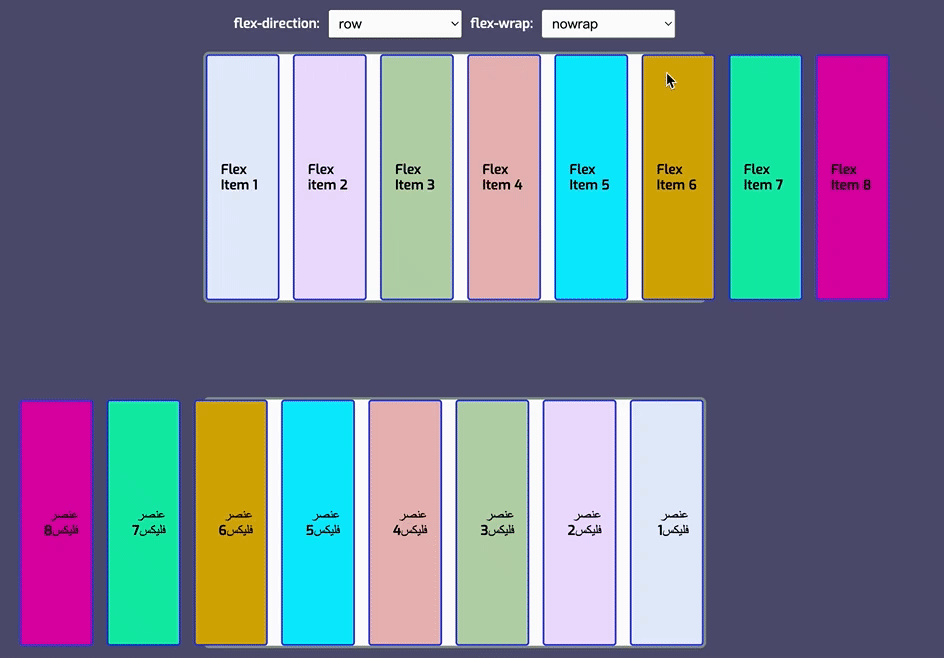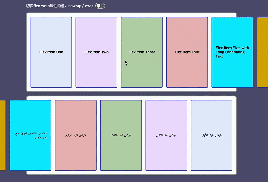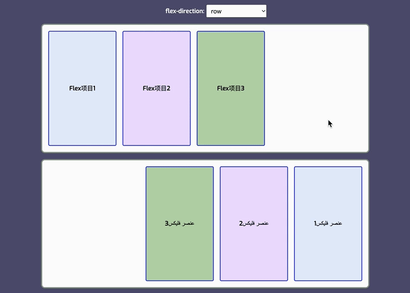 前面我们说过,默认情况下,Flex 项目排成一行,这一行与书写模式(或阅读模式)的方向是相同的,比如上面示例,使用的是英文,它的阅读模式是 ltr ,Flex 项目紧挨着 Flex 容器左侧边缘(左对齐)。这意味着,如果我们使用的是阿拉伯语系,即书写模式是 rtl ,则 Flex 项目将紧挨着 Flex 容器的右侧边缘(右侧对齐):