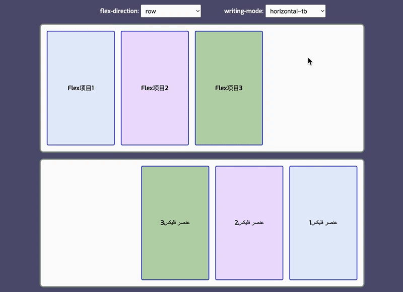 另外,CSS 的 writing-mode 属性的值也将影响 flex-direction 属性最终呈现的效果: