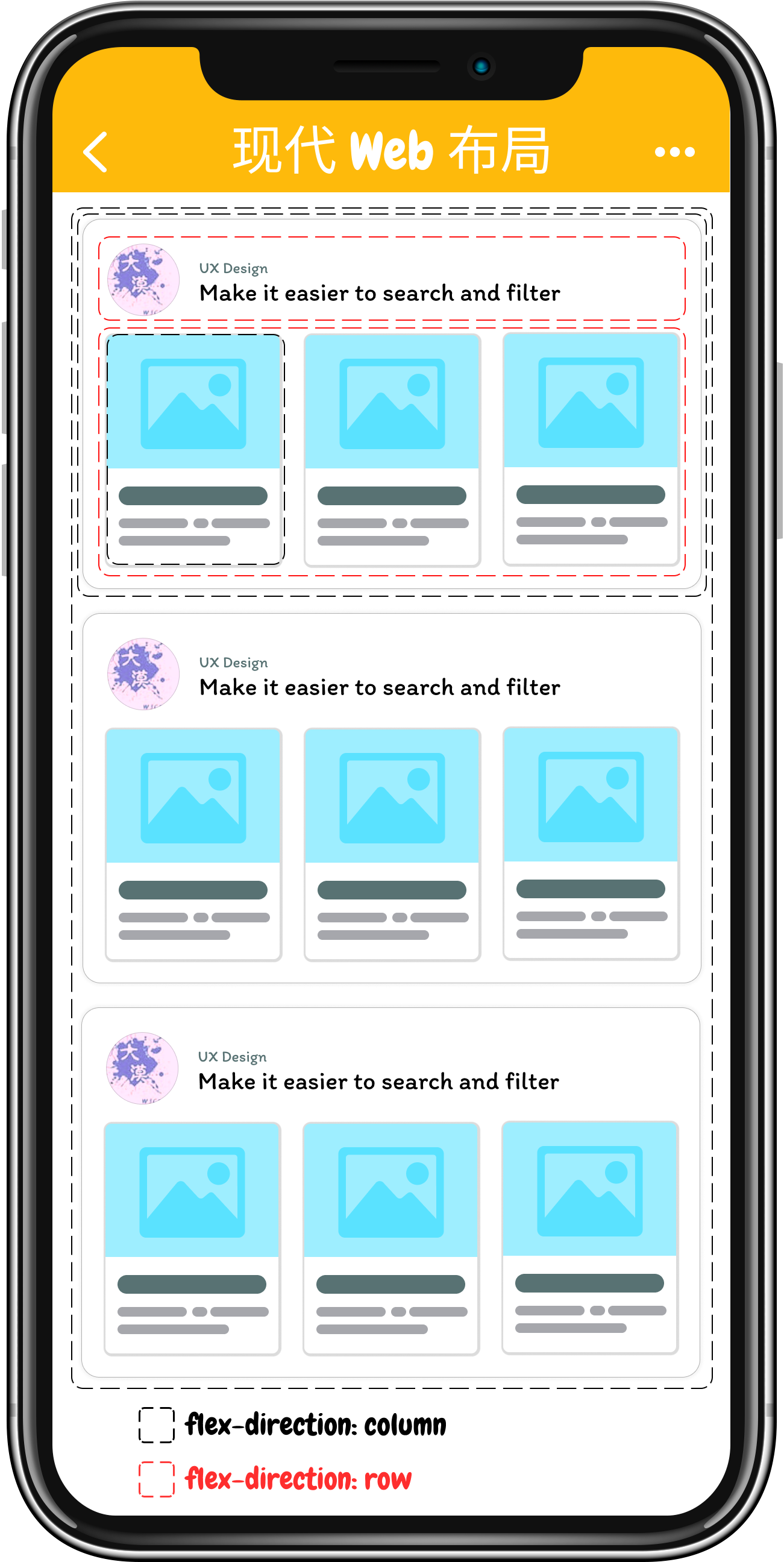 在实际的业务开发中,使用 Flexbox 布局时,flex-direction 是非常有用的,比如下图这个布局效果,红色虚线框中的 Flex 项目是按行排列,flex-direction 不需要显式设置,但黑色虚线框是按列排列,需要显式将 flex-direction 属性的值设置为 column。
