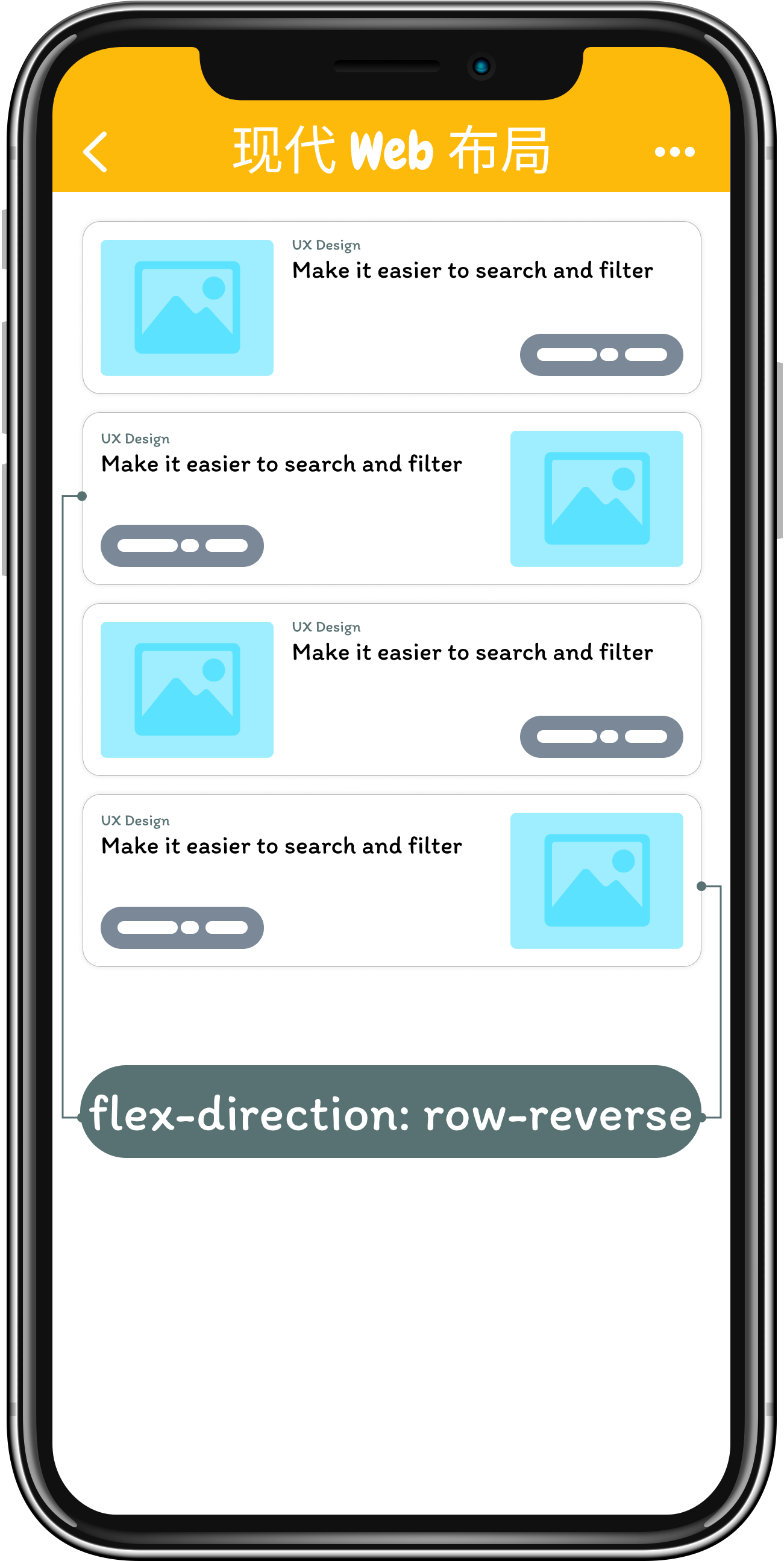 flex-direction 中的 row 和 row-reverse (或 column 和 column-reverse)可以让主轴的起点和终点(或侧轴的起点和终点)互换。它们在一些布局中也是非常有用的,比如像下图这样的效果,希望双数的卡片的缩略图靠右,单数的缩略图居左。我们只需要一行代码即可: