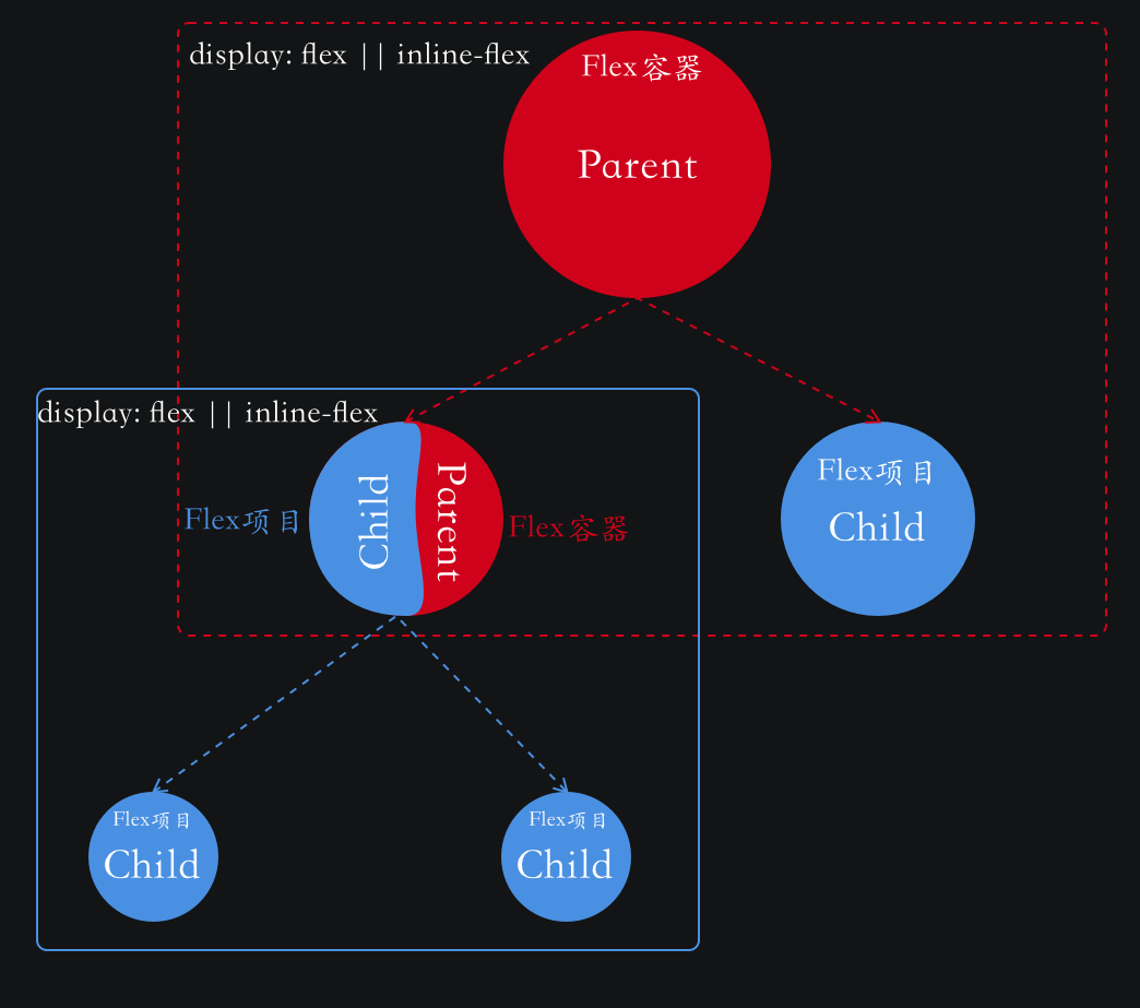 有一点非常的重要,在 Flexbox 布局中, Flex 容器和 Flex 项目之间的关系永远是父子关系。 因此,Flex 项目也可以是它的子元素的 Flex 容器,即显式地在 Flex 项目设置 display 属性值为 flex 或 inline-flex ,该 Flex 项目就成为一个 Flex 容器,而它的子元素就成为 Flex 项目。但它将是一个单独的 Flex 容器,它不会继承祖辈的 Flex 容器上的属性(Flexbox 属性)。