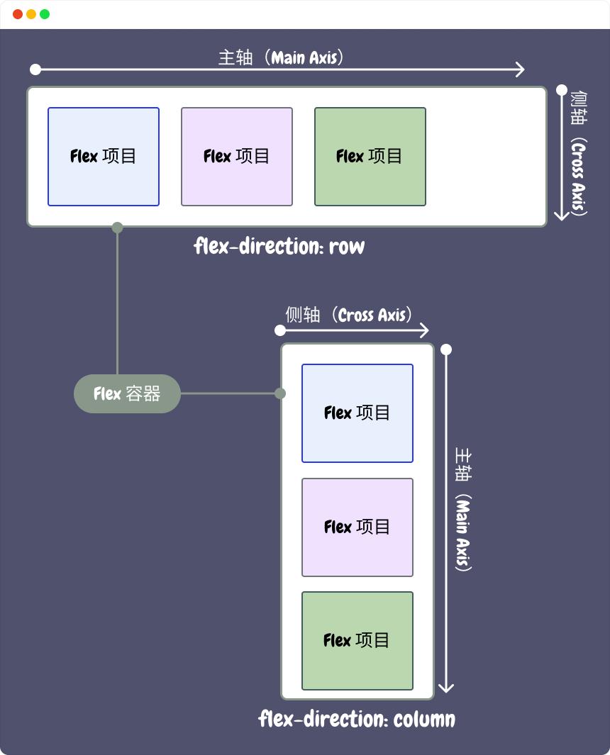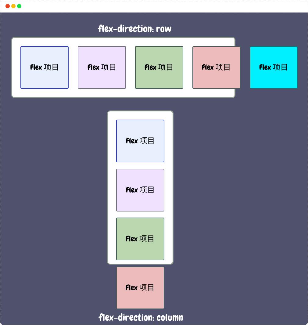 在 Flex 容器中,即使你没有显式设置 flex-direction 属性的值,Flex 容器中的所有 Flex 项目也会显式为一行,因为 flex-direction 属性的初始值是 row 。如果你希望 Flex 项目在 Flex 容器中不是按行呈现,而是按列呈现,则可以将其设置为 column 或 column-reverse 。
