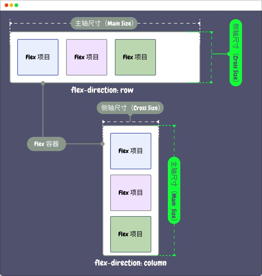 众所周之, CSS 中的每个元素都是一个容器,是容器它就有大小。Flexbox 布局中的 Flex 容器 和 Flex 项目同样是元素,它们也有大小。不同的是,对于 Flex 容器而言,它有 主轴尺寸 (Main Size)和 侧轴尺寸 (Cross Size)之分。它们的差别是: