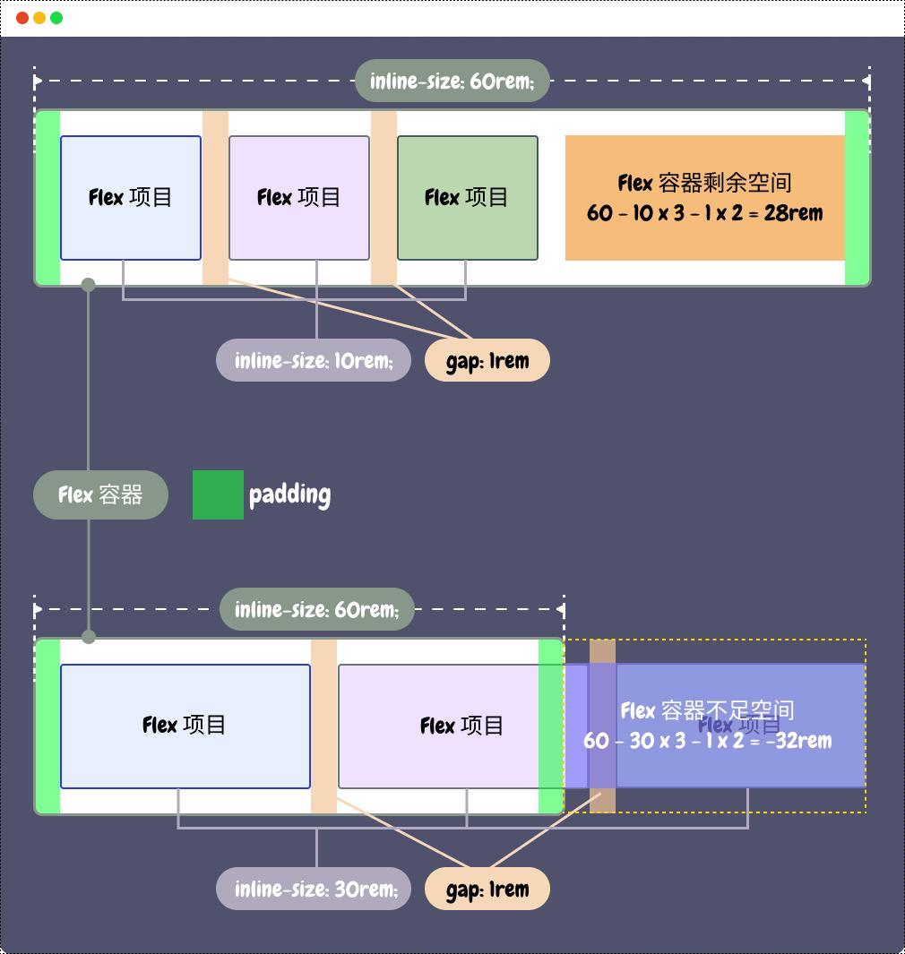 需要注意的是,如果 Flex 容器没有足够多的空间,Flex 项目在溢出之前,每一个 Flex 项目将会尽可能缩小到其最小内容(min-content)的尺寸。即 Flex 项目一旦达到最小内容(min-content)大小, Flex 项目将开始溢出 Flex 容器 !
