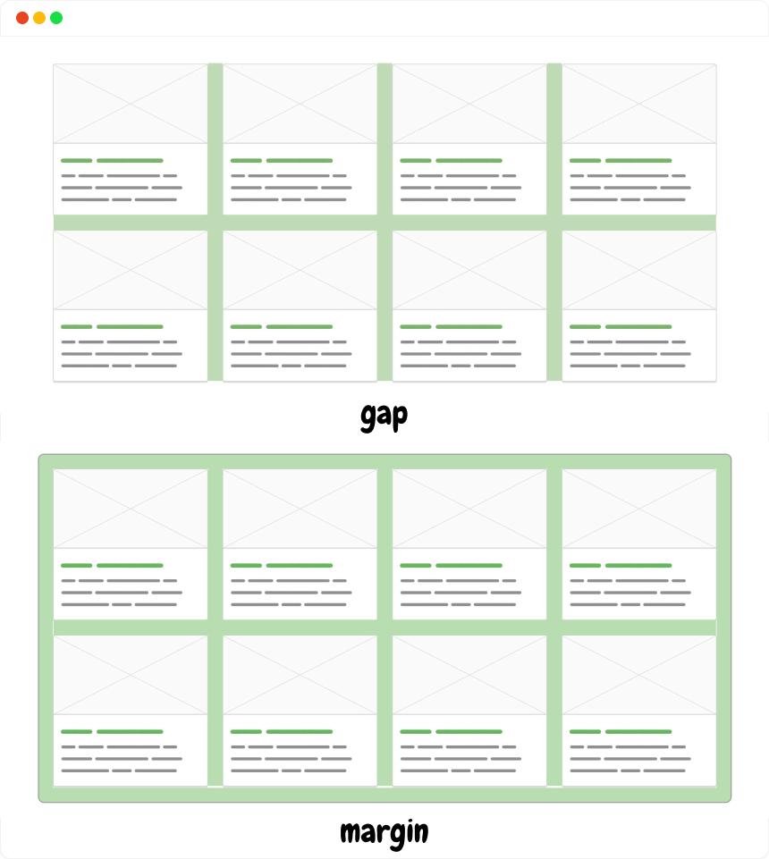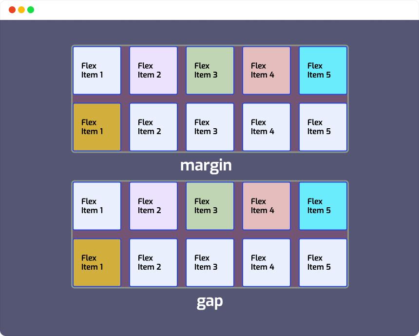 }在上面我们介绍 Flexbox 术语和概念时提到过,gap 和 margin 虽然都可以设置元素与元素之间的间距,但它们之间有明显的差异:
