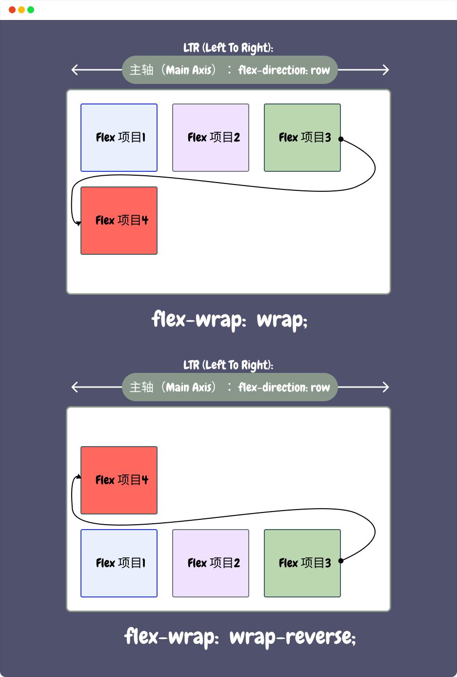 flex-wrap 属性除了取值为 wrap 会让 Flex 项目换行排列之外,其另一个属性 wrap-reverse 也会让 Flex 项目换行排列,只不过行的排列方向和 wrap 相反。假如你使用的语言是英文,即书写模式和阅读模式都是 ltr ,那么 flex-wrap 取值为 wrap 时,Flex 行的排列将会沿着 Flex 容器侧轴方向从开始处(Flex 容器顶部)向下排列;反之 flex-wrap 取值为 wrap-reverse 时, Flex 行的排列将会沿着 Flex 容器侧轴方向从终点处(Flex 容器底部)向上排列:
