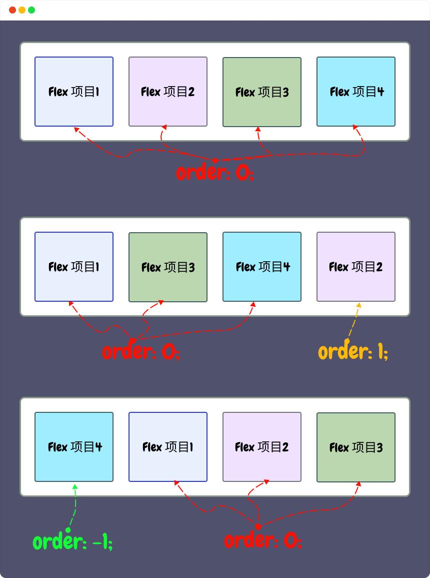 使用 order 属性可以为 Flex 容器中的项目重新排序。此属性可用于对 有序组 中的项目进行排序。项目按照 flex-direction 指定的方向排列,最小值在最前面。如果多个项目具有相同的值,它将与具有该值的其他项目一起显示(按其在源码文档的顺序排列)。