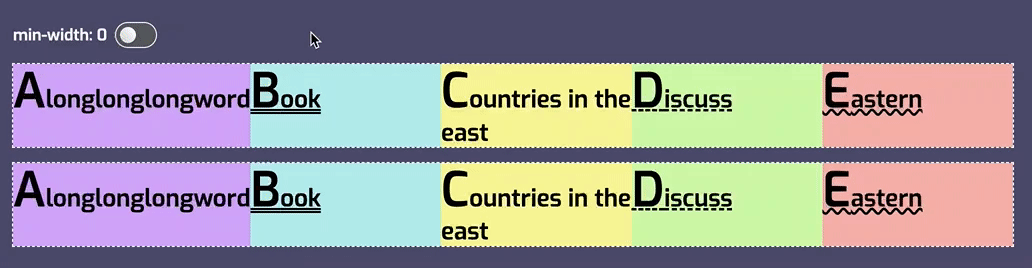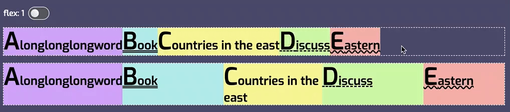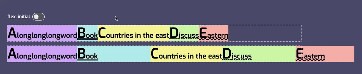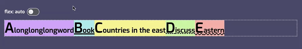 简单地说,要使项目增长,同时允许大 Flex 项目比小 Flex 项目拥有更多空间,请使用 flex:auto。这也意味着 Flex 项目最终具有不同的大小,因为 Flex 项目之间共享的空间,将在每个 Flex 项目被设为最大内容大小(max-content)之后被均分。因此,较大的 Flex 项目会获得更多的空间。