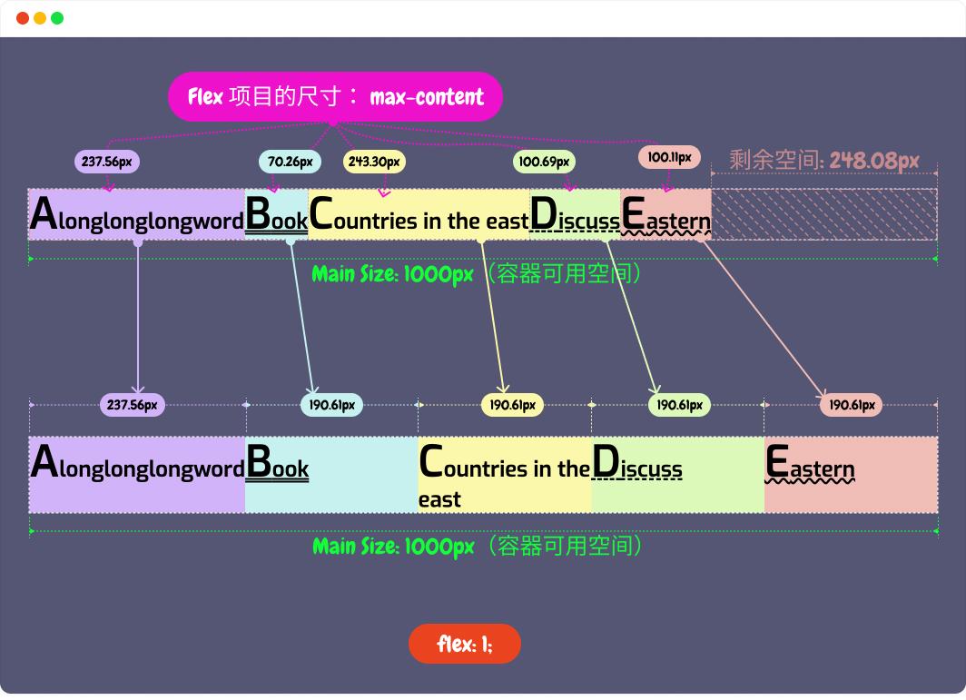 max-content),同时浏览器根据内容多少,可计算出其宽度的具体值是多少像素值。我们示例中每个 Flex 项目的宽度分别是237.56px、70.26px、243.30px、100.69px和100.11px。
