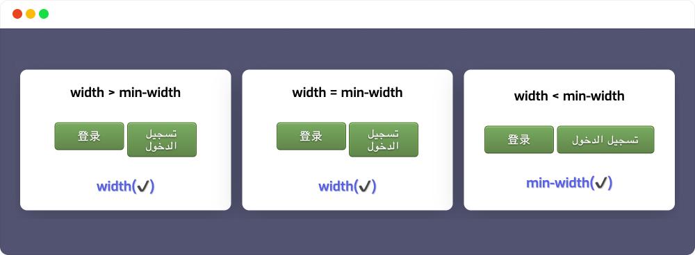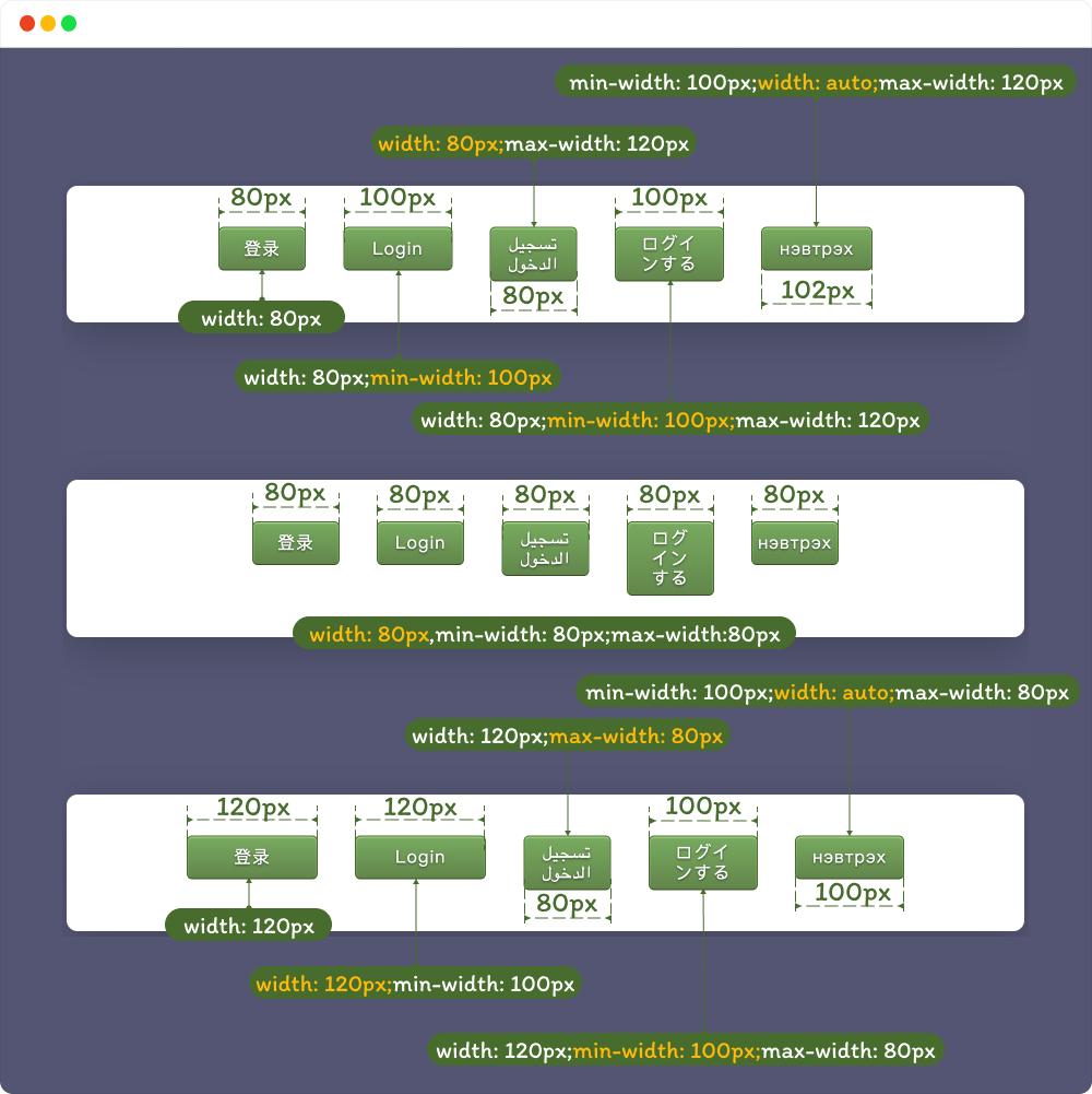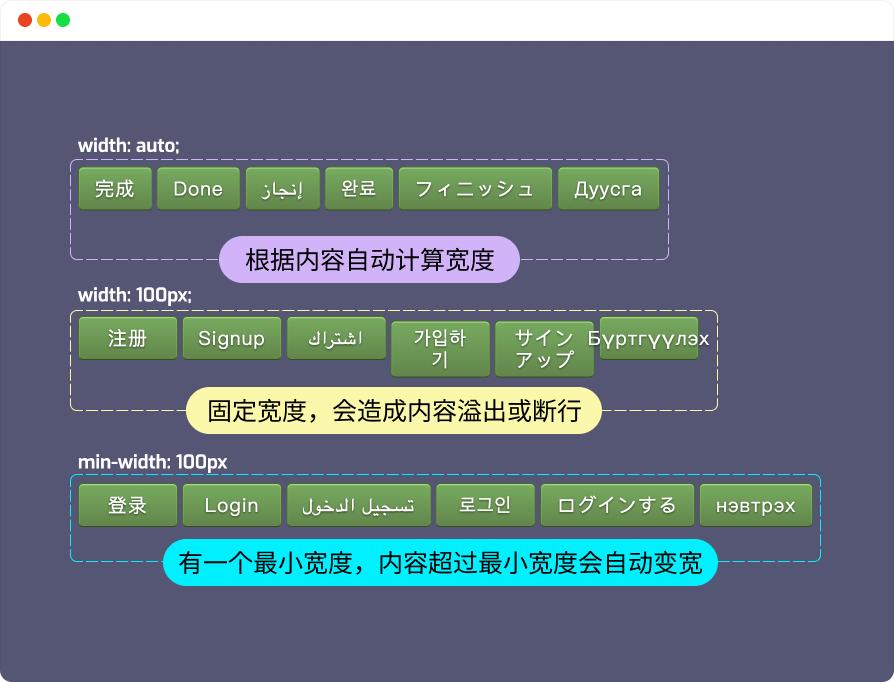 min-width 属性在构建 Web 布局或 Web 组件时是很有用处的,尤其是在构建一个 多语言 的 Web 页面或 Web 应用中。在多语言版本网站中“表达同一个意思的文本内容所占宽度是不一致的 ”,比如一个“完成”按钮,中文可能是“完成”,英文可能是“Done”,阿位伯文是“إنجاز”,韩文是“완료”,日文可能是“フィニッシュ”,蒙古语又是“Дуусга”,等等。