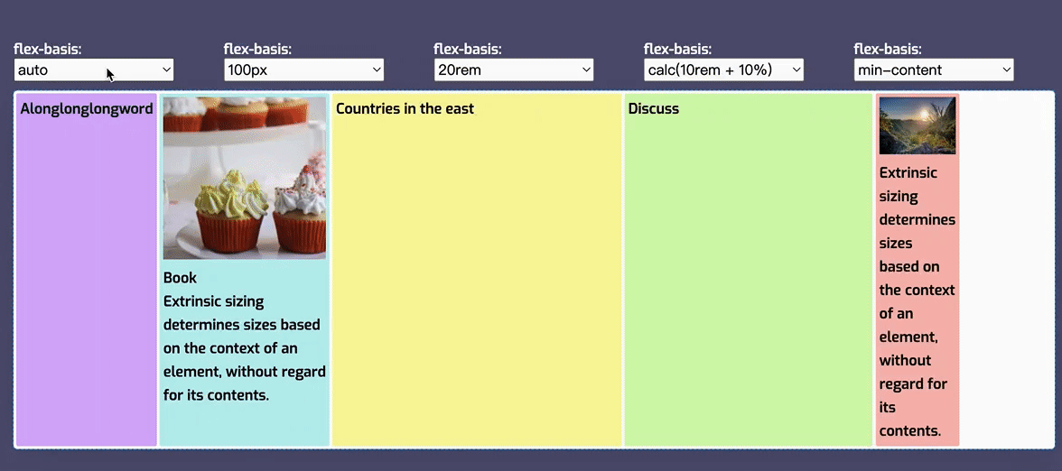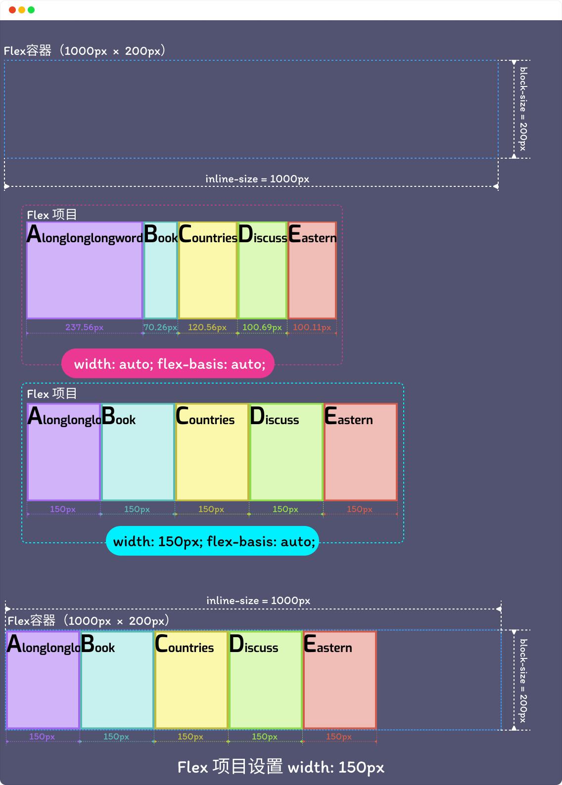 有一点需要注意的是,如果在 flex-basis 属性上设置了除 auto 和 content 之外的所有值,它和书写模式以及阅读模式是有关的,在水平书写模式(ltr 或 rtl),flex-basis 的解析方式与 width 相同。