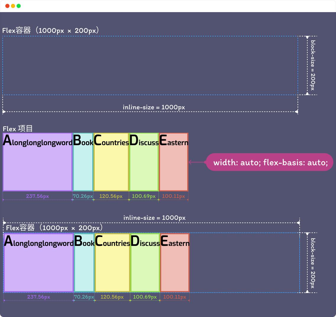 如果 flex-basis 的值设置为 auto ,浏览器将先检查 Flex 项目的主尺寸(Main Size)是否设置了绝对值,再计算 Flex 项目的初始值。比如说,你给 Flex 项目显式设置了 width: 200px,那么 200px 就是 Flex 项目的 flex-basis 值,该值也被称为是 Flex 项目的假设主尺寸,因为 Flex 项目的最终主尺寸(flex-basis 计算后的值)会受 Flex 容器剩余空间或不足空间的影响,除非 flex-grow 和 flex-shrink 两属性的值都显式设置为 0 。