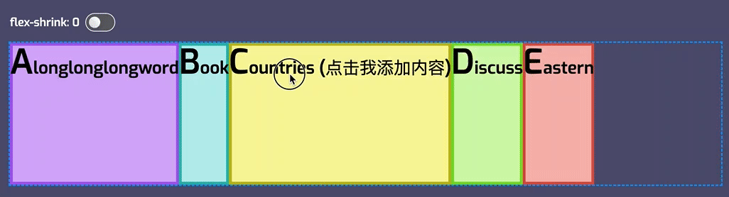 你可能已经发现了,由于在 Flex 项目上设置的 width 值小于 Flex 项目的内容最小尺寸(min-content),将会造成 Flex 项目内容溢出,这和其他溢出容器的表现是一样的。而且 flex-grow 属性使用的也是其初始值 0 ,所以 Flex 项目并不会去分配 Flex 容器的剩余空间,除非重置 Flex 项目的 flex-grow 值。
