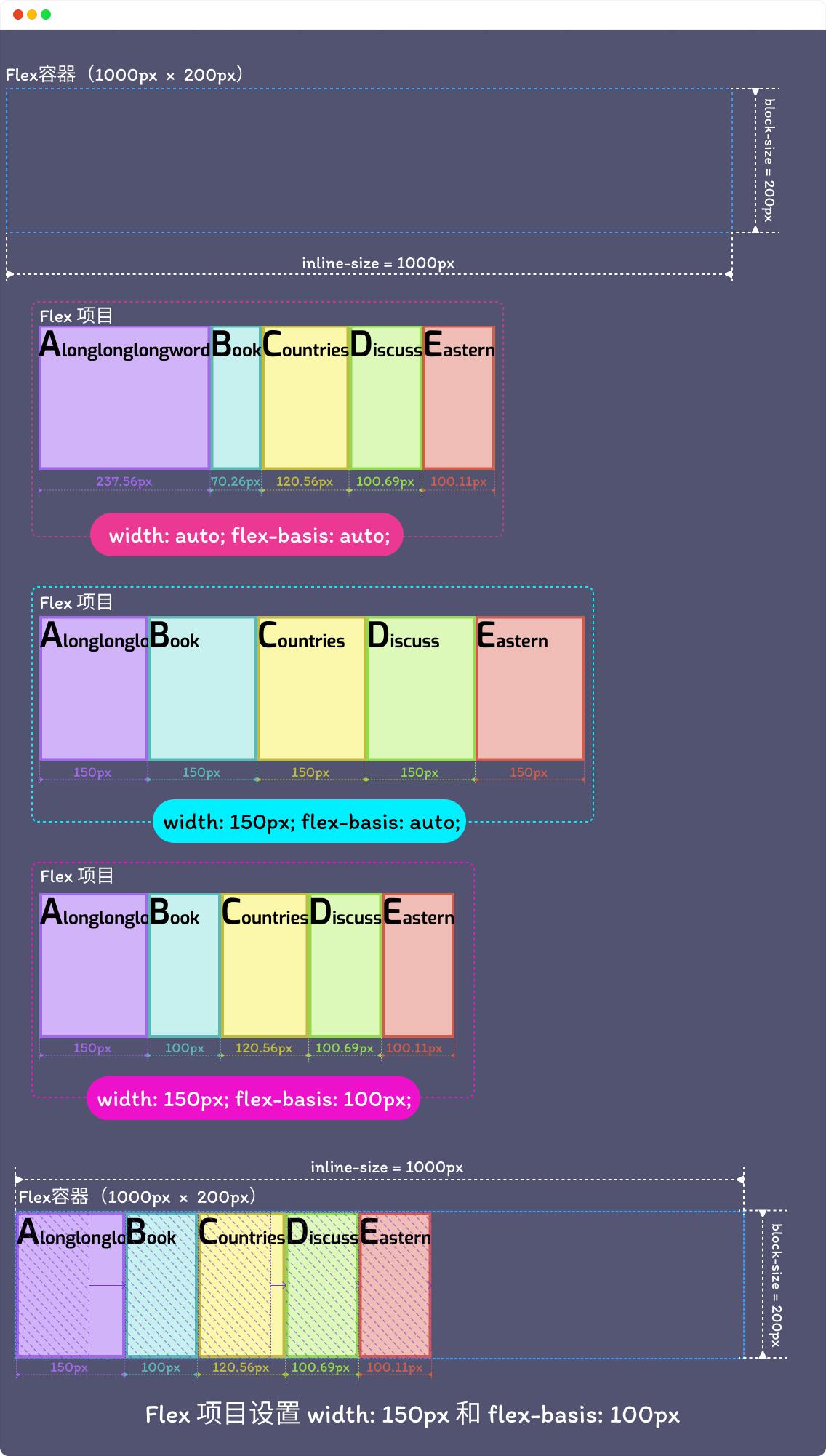 正如你所见,如果 Flex 项目上同时显式设置了 width 和 flex-basis 值(非 auto 默认值)时,flex-basis 属性的值将会替代 width 的值。但是: