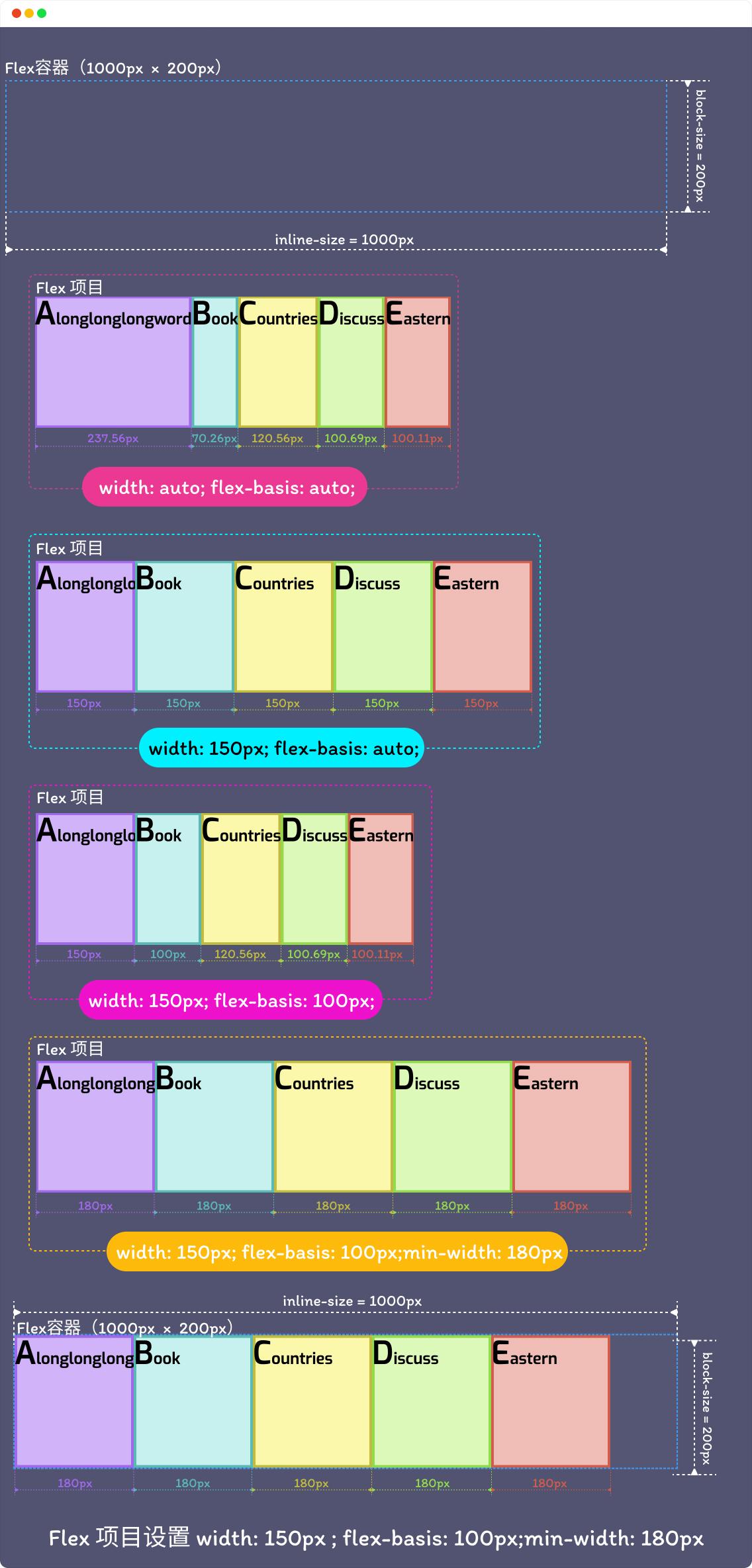 }最终所有 Flex 项目的初始化值(Base Size)是 100px ,最小值(Minimum Size)是 180px ,浏览器最终计算出来的 flex-basis 值也会是 min-width 值,即 180px :