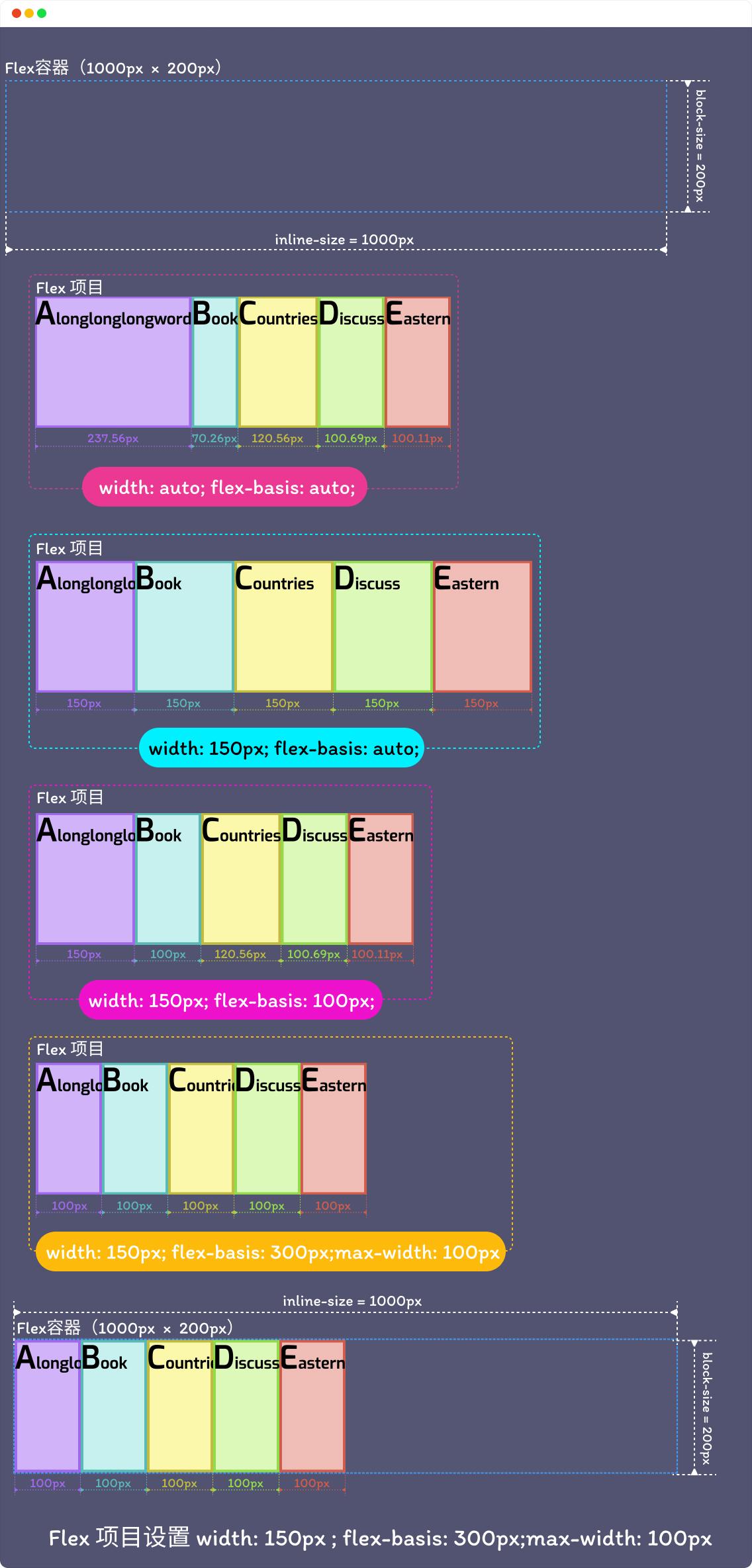 }最终所有 Flex 项目的初始化值(Base Size)是 300px ,最大值(Maximum Size)是 100px ,浏览器最终计算出来的 flex-basis 值也会是 max-width 值,即 100px :