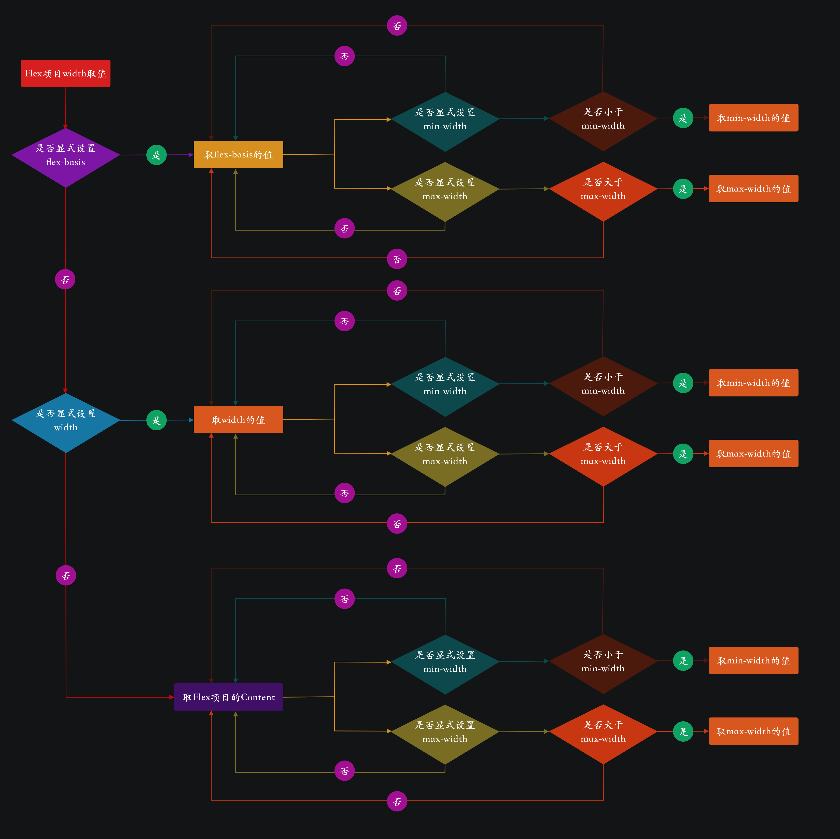如果 Flex 项目同时出现 width 、flex-basis 、min-width 和 max-width 时,会在上面的规则上增加新的一条规则来进行判断: