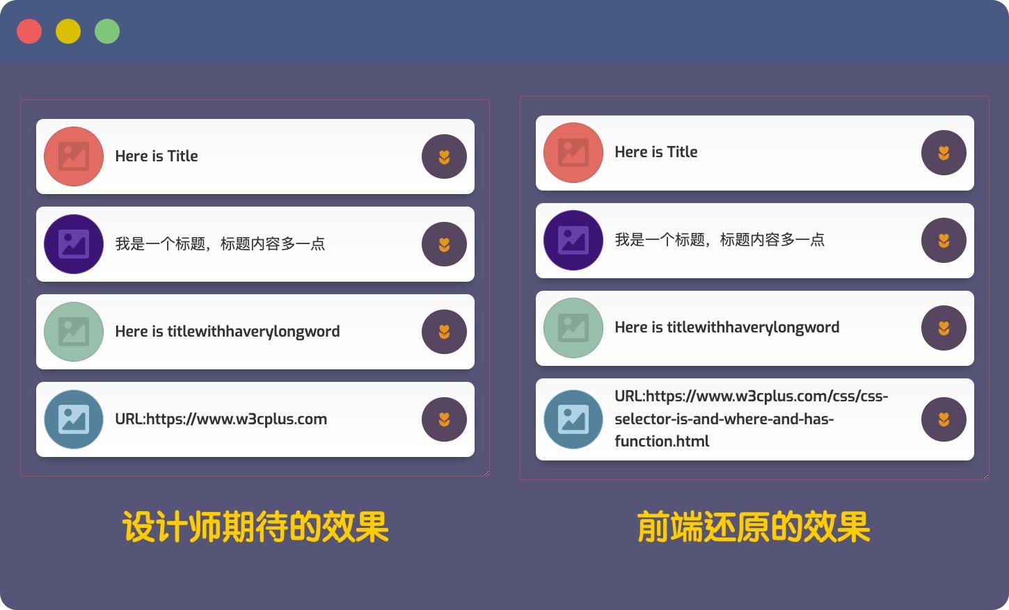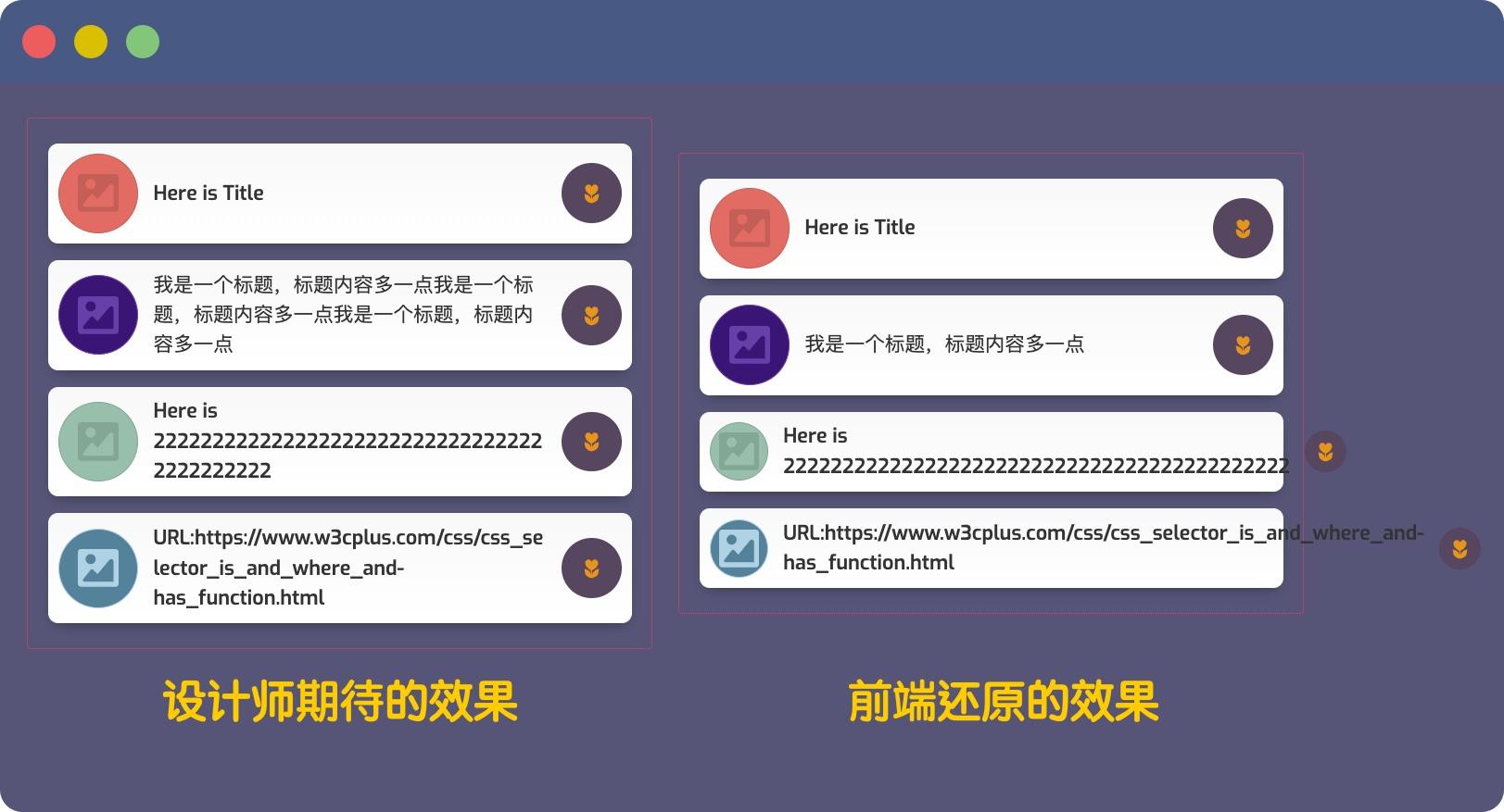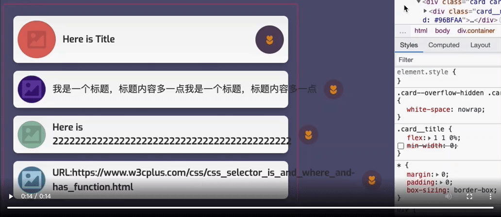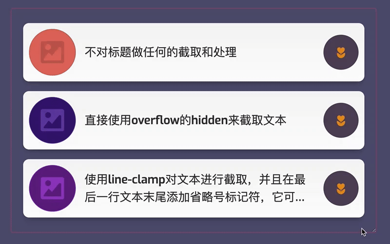 设计师期望卡片标题在同一行,不能因为内容过长而让设计效果失去一致性。为此,我们可以使用上面代码 ② 来截取文本,并且在文本末尾出现三个点的省略号: