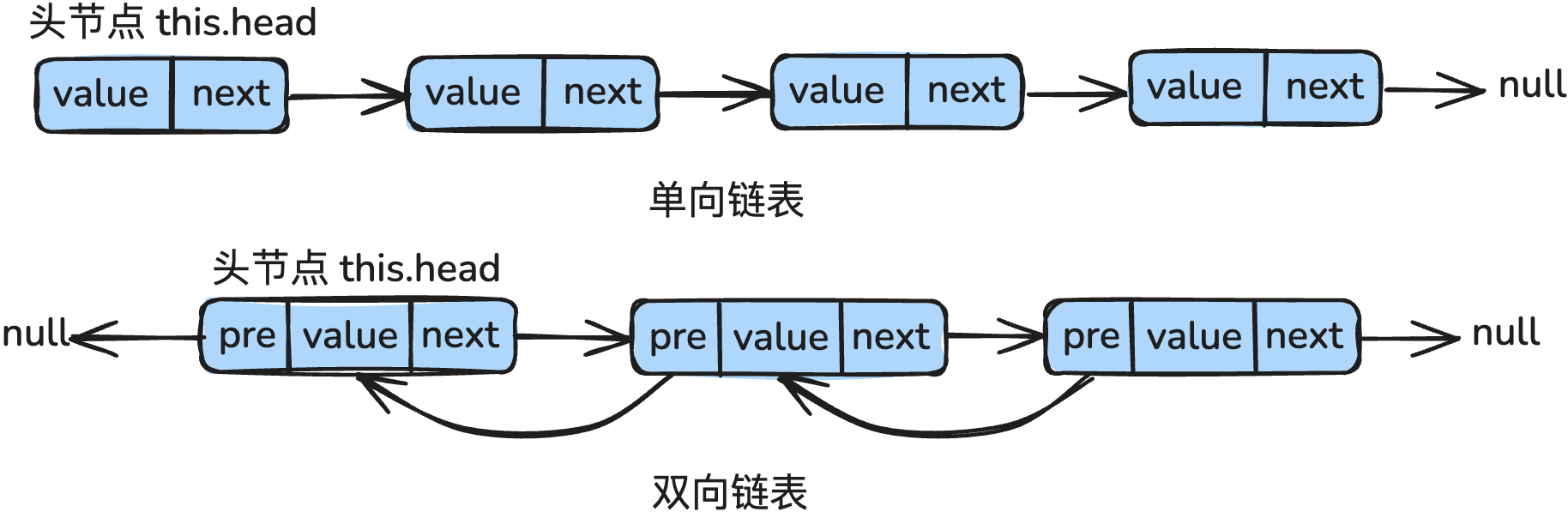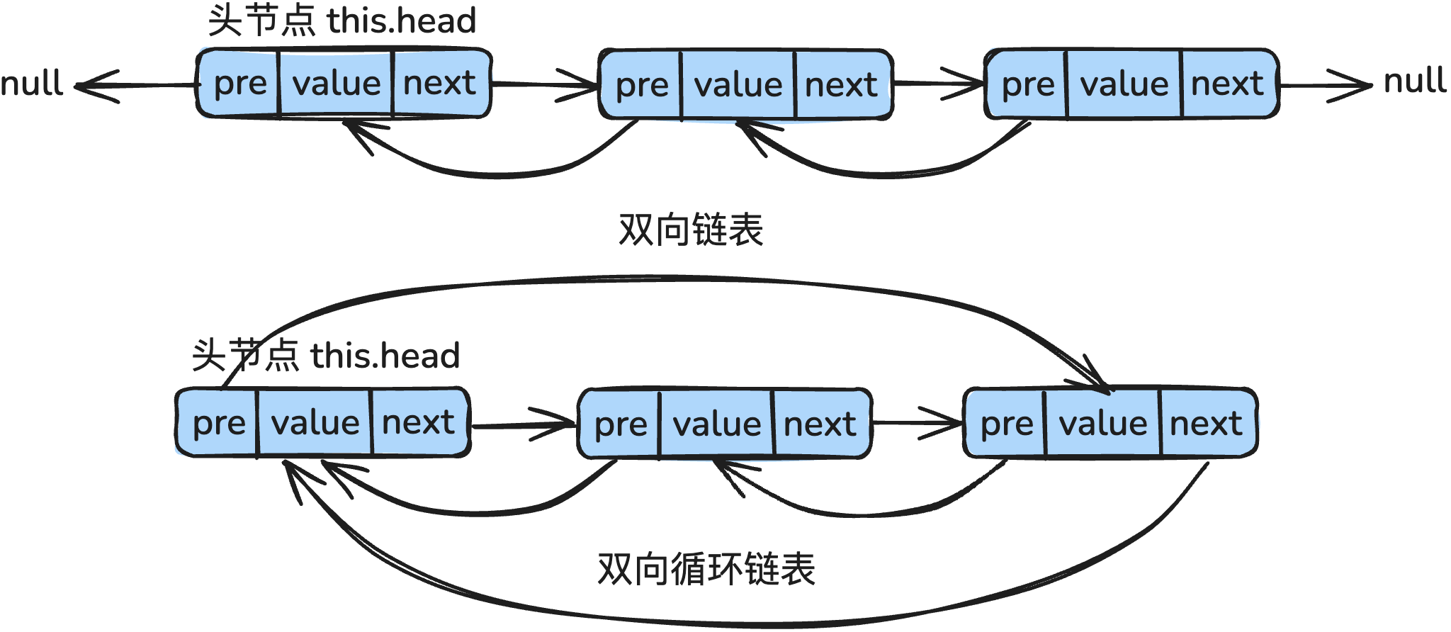 对比普通的双向链表,双向循环链表的尾节点的 next 指向头节点,头节点的 prev 指向尾节点。