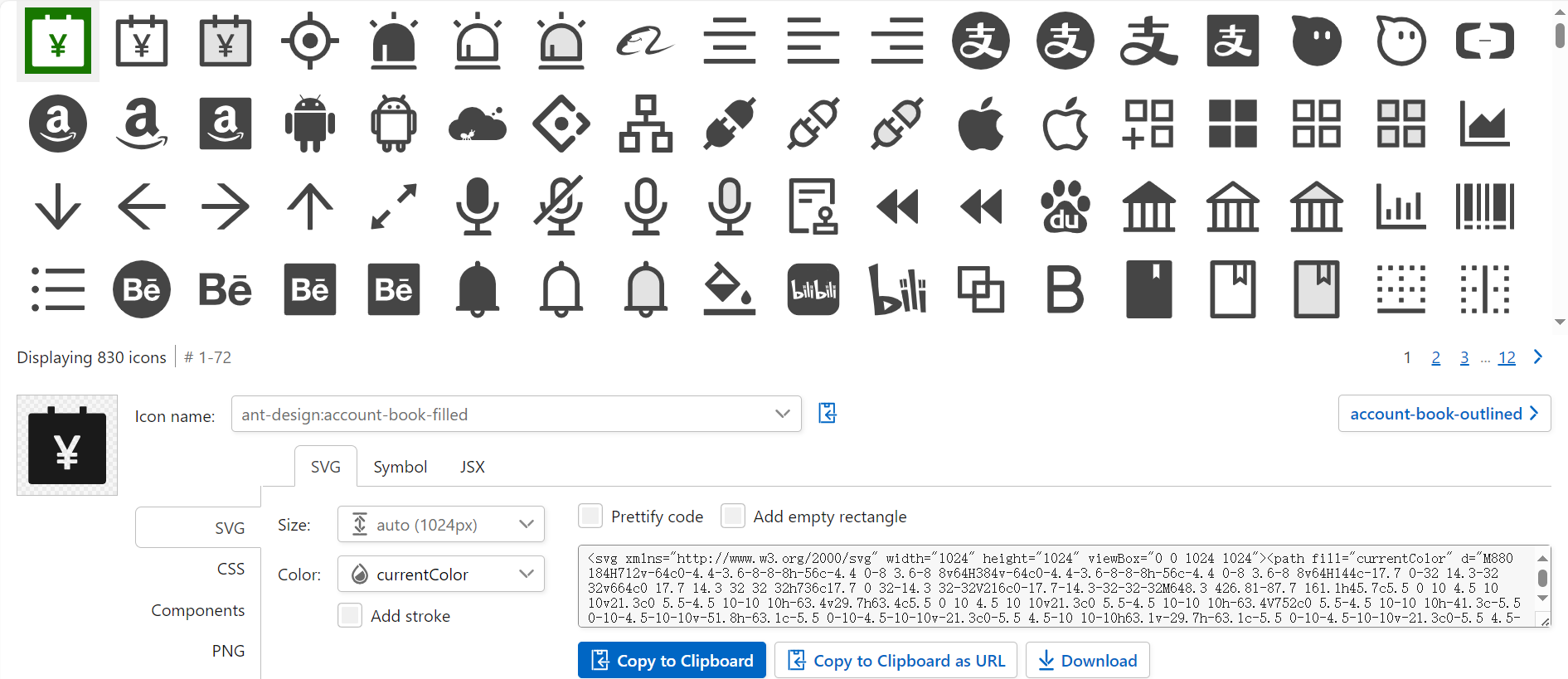 去 Iconify 官网上,搜索我们安装的 ant-design 图标库,点击想要使用的图标,复制 Icon name (如 ant-design:account-book-filled)备用。