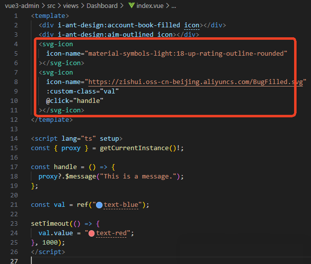 };在 src/components 文件夹下新建 SvgIcon 文件夹,新建 index.vue 文件,封装图标组件如下: