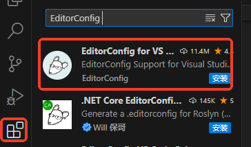 如下图,在 vscode 中搜索 EditorConfig 插件,安装 EditorConfig 插件。